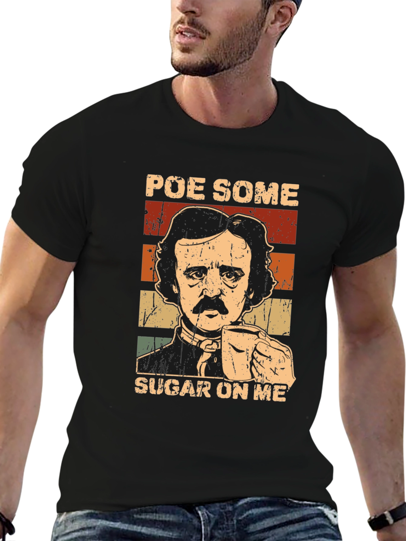 Show off your literary humor with this black graphic tee! This shirt features a distressed vintage design with a portrait of Edgar Allan Poe, alongside the playful phrase "Poe Some Sugar On Me". Perfect for book lovers, English teachers, or anyone who appreciates a witty pun, this short-sleeve tee is made for comfortable wear. Pair it with jeans for a casual look, or dress it up with a blazer for a touch of academic flair. A great conversation starter, this unique t-shirt will add some personality to your wardrobe!