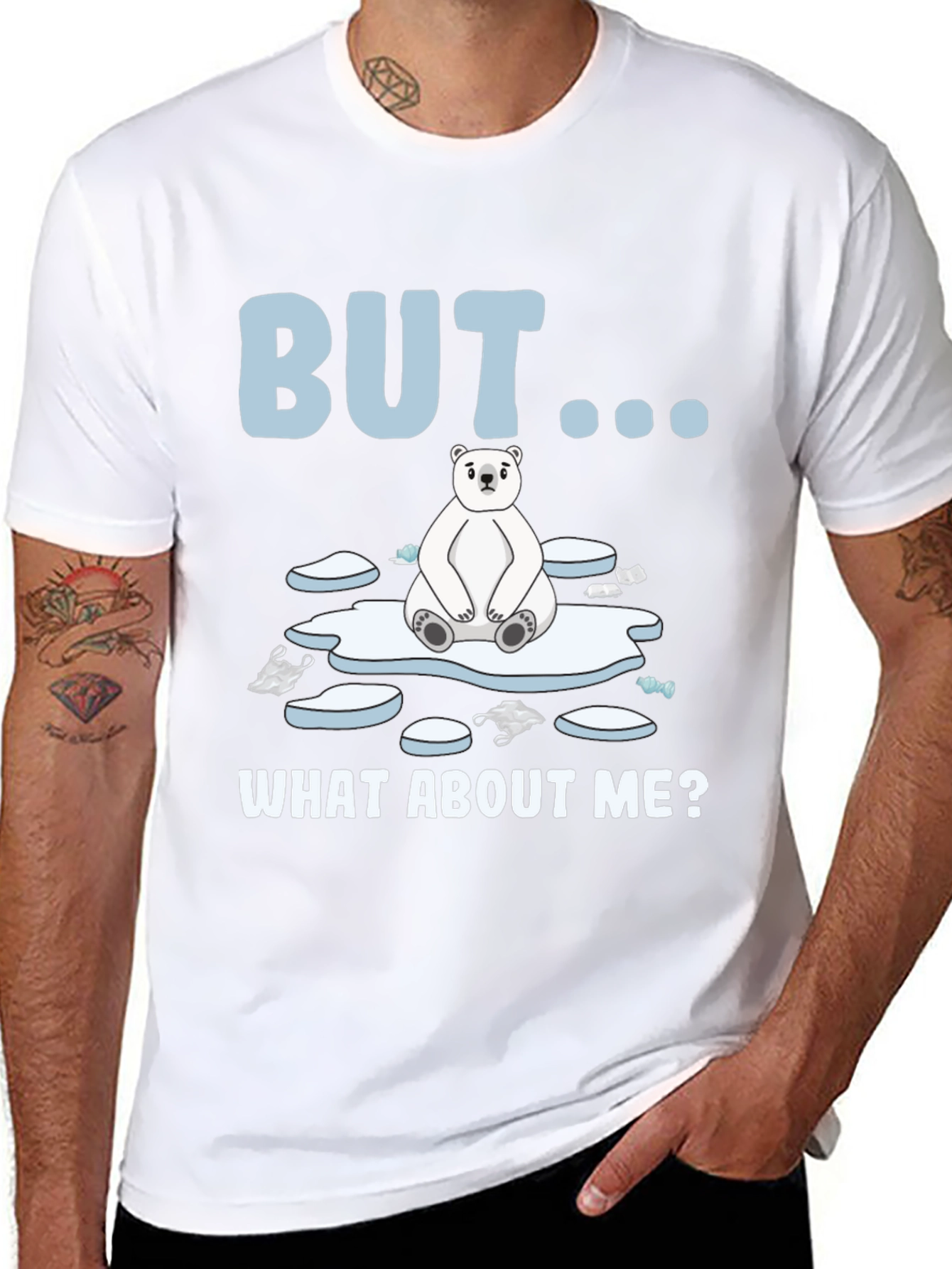 This eye-catching black t-shirt features a poignant graphic of a polar bear sitting on melting ice floes surrounded by discarded face masks. Above the bear, the word "BUT..." is printed in a light blue, with "WHAT ABOUT ME?" below. The message is clear: a call to action to protect our planet and its vulnerable inhabitants. Made from what appears to be a soft and breathable fabric, this tee offers both style and comfort. Wear it to raise awareness about climate change or as a statement piece. This shirt is a conversation starter and perfect for anyone passionate about wildlife conservation and environmental issues. A meaningful addition to any wardrobe.
