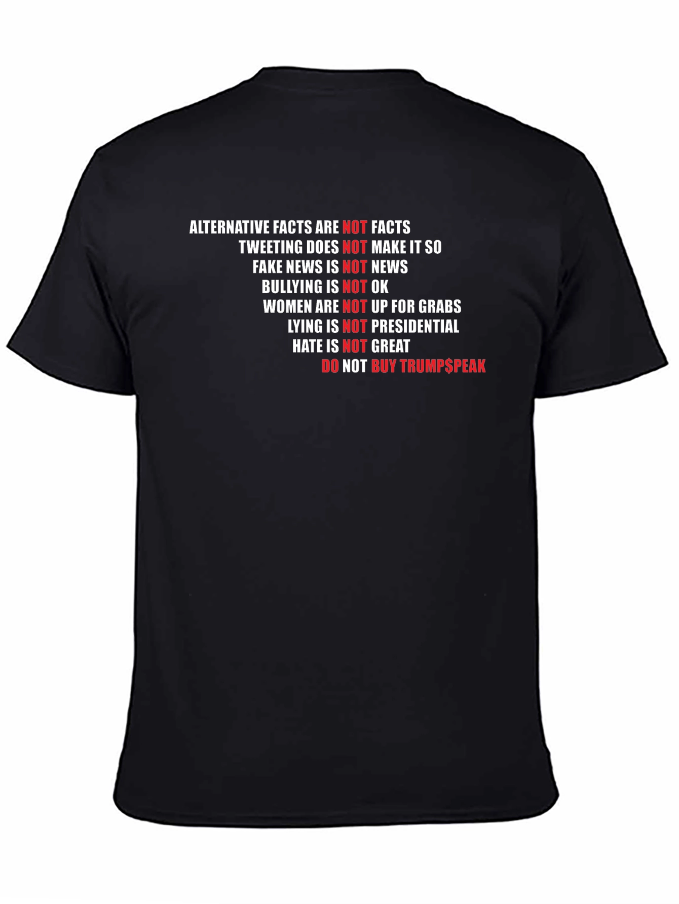 Make a statement with this bold black t-shirt. Featuring a powerful message in contrasting white and red text, this shirt declares: "Alternative Facts are NOT Facts," "Tweeting Does NOT Make It So," "Fake News is NOT News," and more. It's a wearable protest against misinformation. Constructed from a comfortable fabric, this tee is ideal for rallies, protests, or everyday wear. The design is eye-catching and sure to spark conversations. Stand up for what you believe in with this unique and expressive piece of apparel. Available in various sizes. Show your political stance and make a bold statement against the current political climate with this powerful message tee.