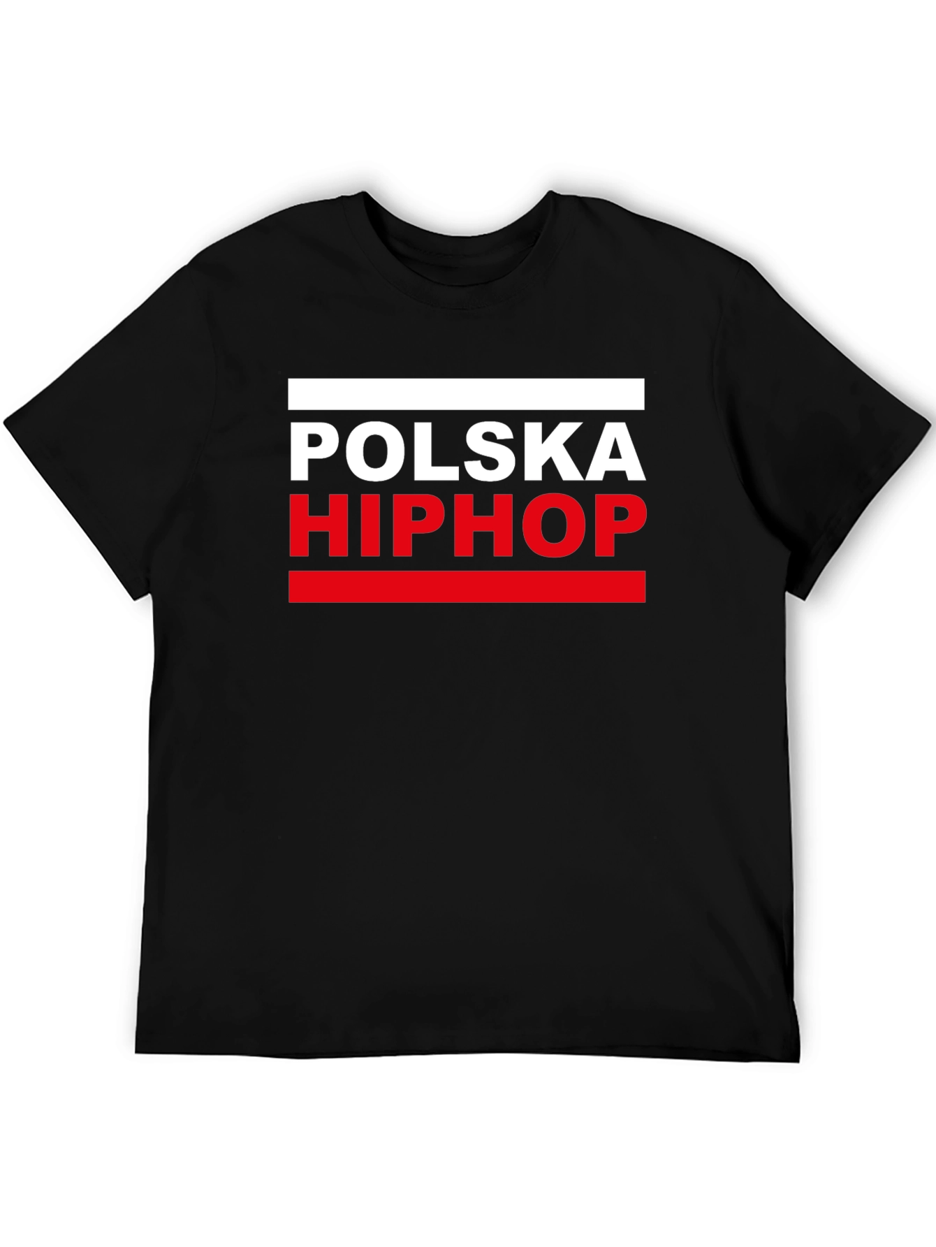 Show off your love for Polish hip hop with this stylish black t-shirt. The design features "POLSKA" in bold white lettering above "HIPHOP" in striking red, separated by horizontal bars in the same colors, creating a powerful visual statement. Made from comfortable, breathable fabric, this tee is perfect for everyday wear, concerts, or casual outings. The classic fit makes it a versatile addition to any wardrobe. Express your cultural pride and musical passion with this eye-catching graphic tee. Get yours today and represent!