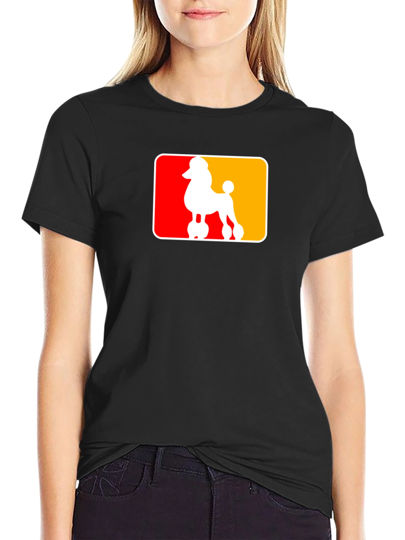 Show off your love for poodles with this stylish black t-shirt. This classic tee features a eye-catching graphic of a white poodle silhouette set against a vibrant split red and yellow rounded rectangle background. Made from a comfortable and breathable fabric, this t-shirt is perfect for everyday wear. Whether you're strolling through the park, running errands, or simply relaxing at home, this tee will keep you looking and feeling great. Its unique design makes it a great conversation starter. Get yours today and let your poodle pride shine!