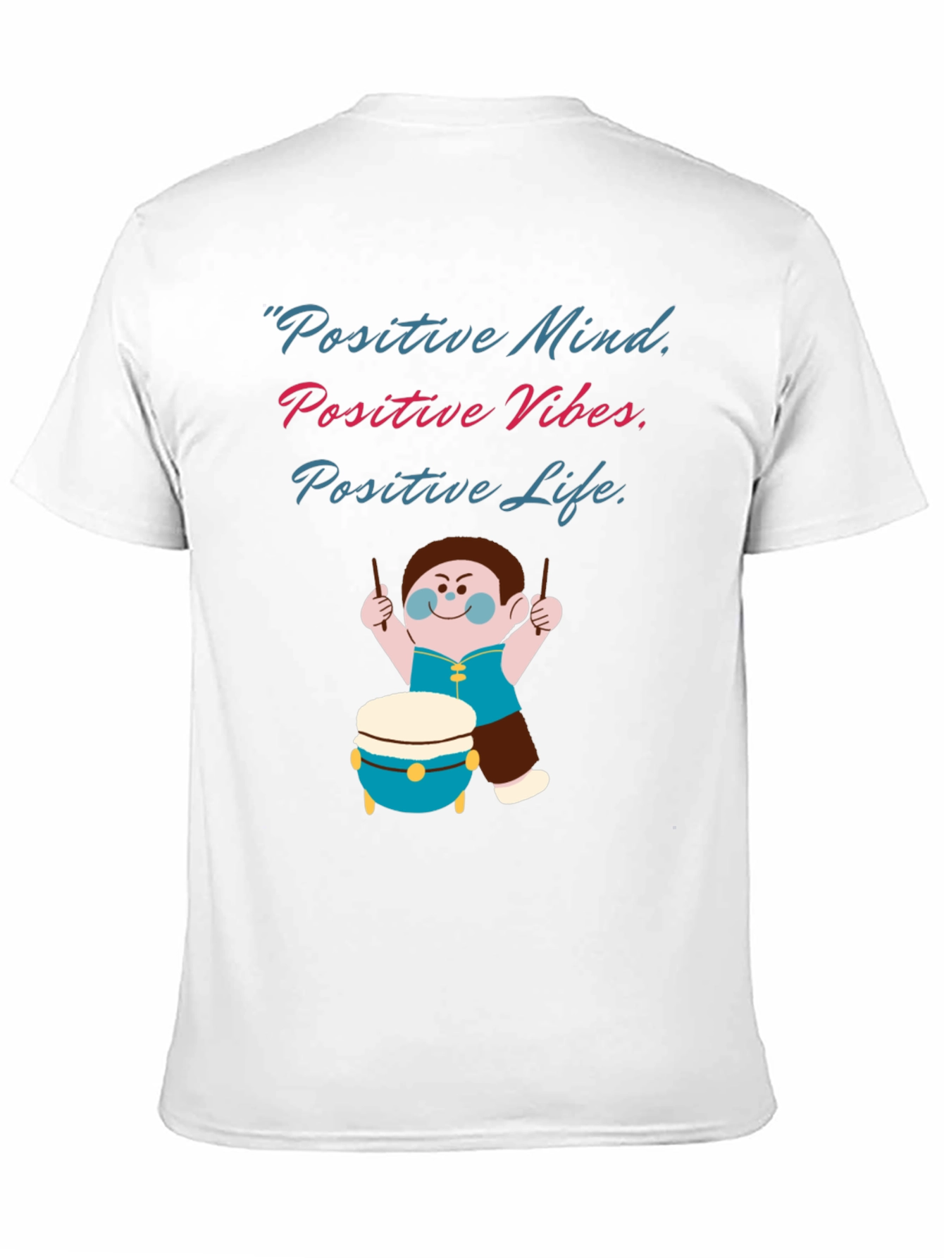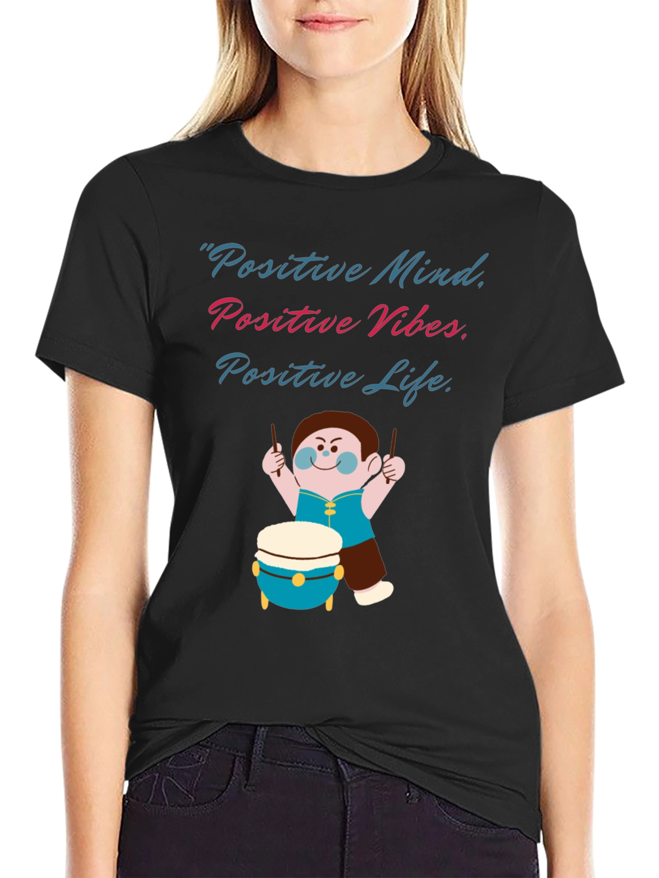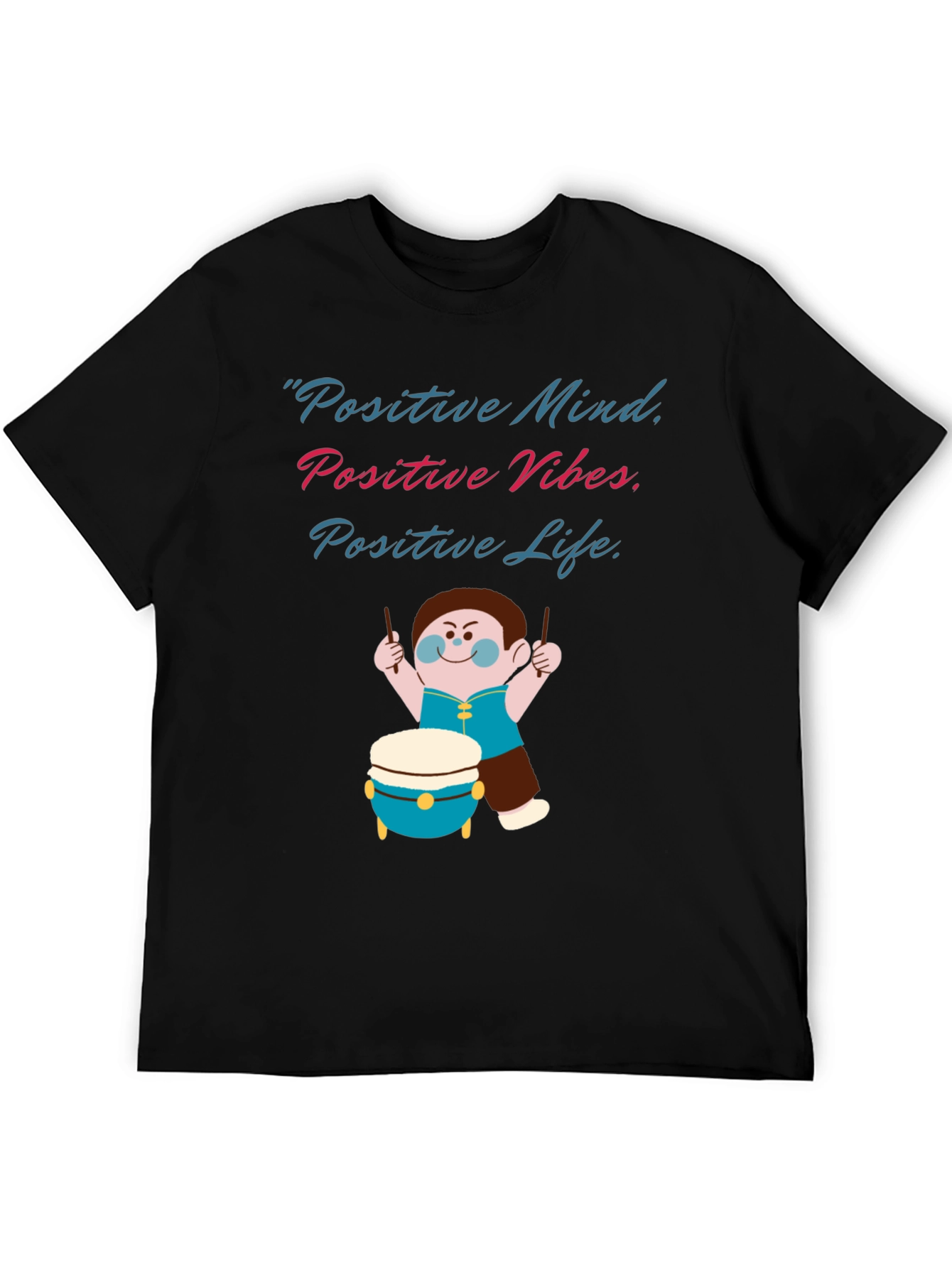 Embrace positive energy with this stylish black graphic tee. The shirt features the uplifting quote "Positive Mind. Positive Vibes. Positive Life." above a playful cartoon of a child drummer. Made from soft, comfortable fabric, this crew neck t-shirt is perfect for everyday wear. The vibrant colors of the graphic pop against the black backdrop, making it a fun and eye-catching piece. Ideal for casual outings, workouts, or lounging at home, this tee is a great way to spread good vibes wherever you go. Add a touch of positivity to your wardrobe with this unique and inspiring t-shirt!