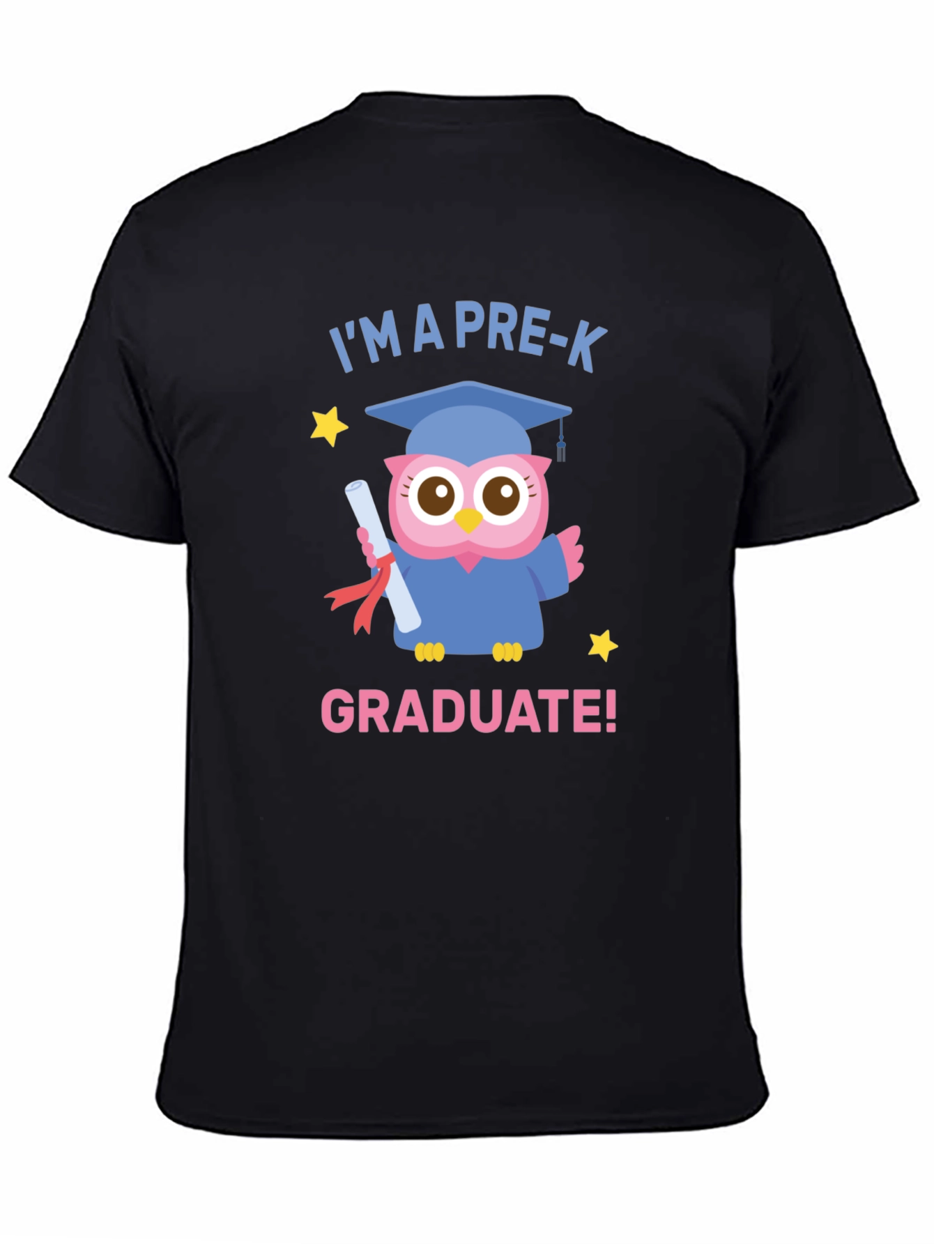 Celebrate your little one's Pre-K graduation with this adorable black t-shirt! Featuring a cute cartoon owl wearing a graduation cap and gown and holding a diploma, this shirt is perfect for the graduate. The phrases "I'm a Pre-K" and "Graduate!" are displayed in a playful font. This design would be great for pre-k graduation day or a fun way to commemorate this important milestone.