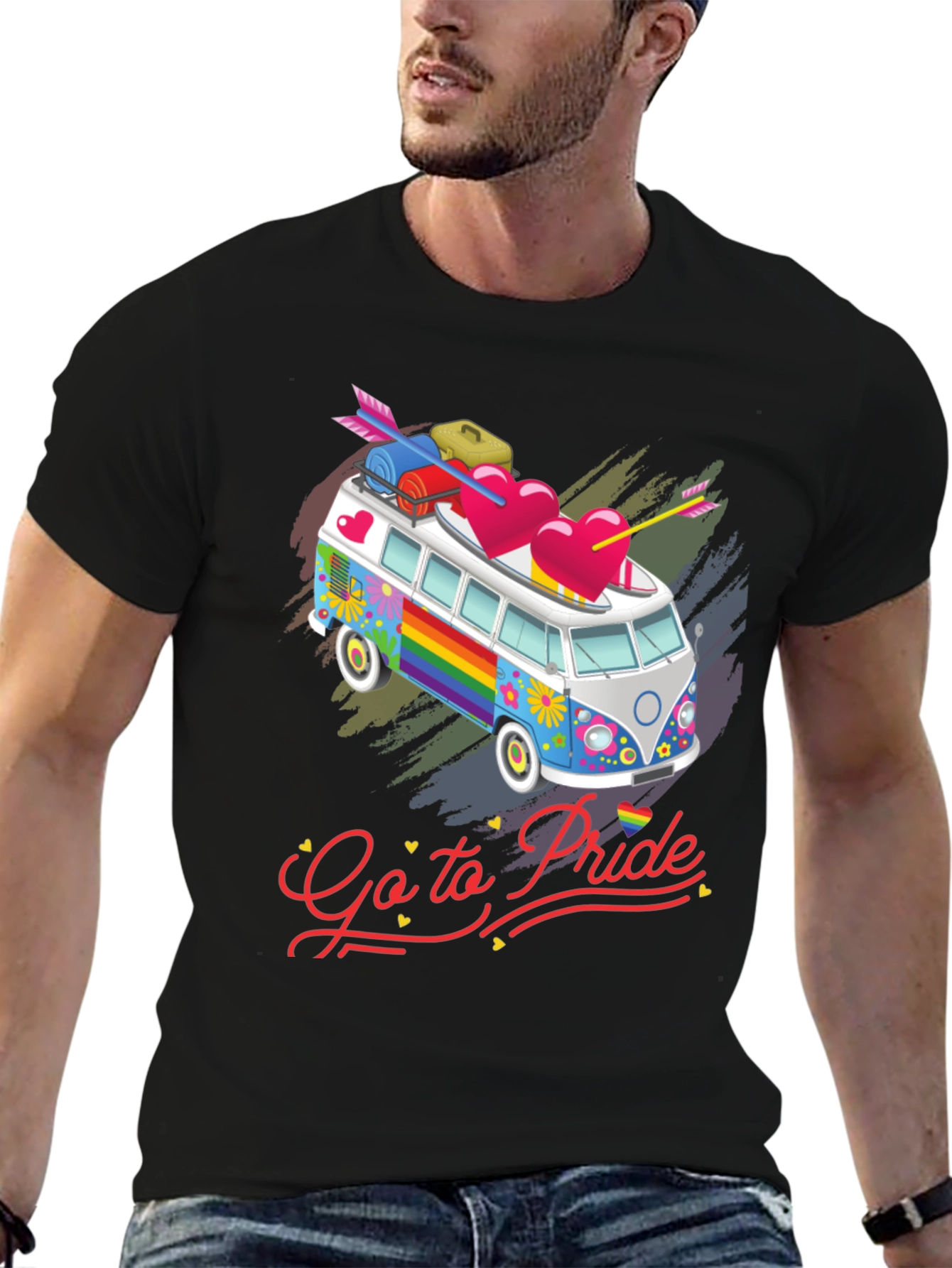 Celebrate Pride in style with this vibrant graphic t-shirt. The design features a classic bus adorned with rainbow colors and whimsical floral details. Two hearts pierced with an arrow sit atop the bus. The words 'Go to Pride' is written in a festive font. This shirt is perfect for Pride events, casual outings, or as a statement piece to show your support. Made from comfortable fabric, this tee offers a relaxed fit. Let your true colors shine with this eye-catching pride-themed t-shirt!