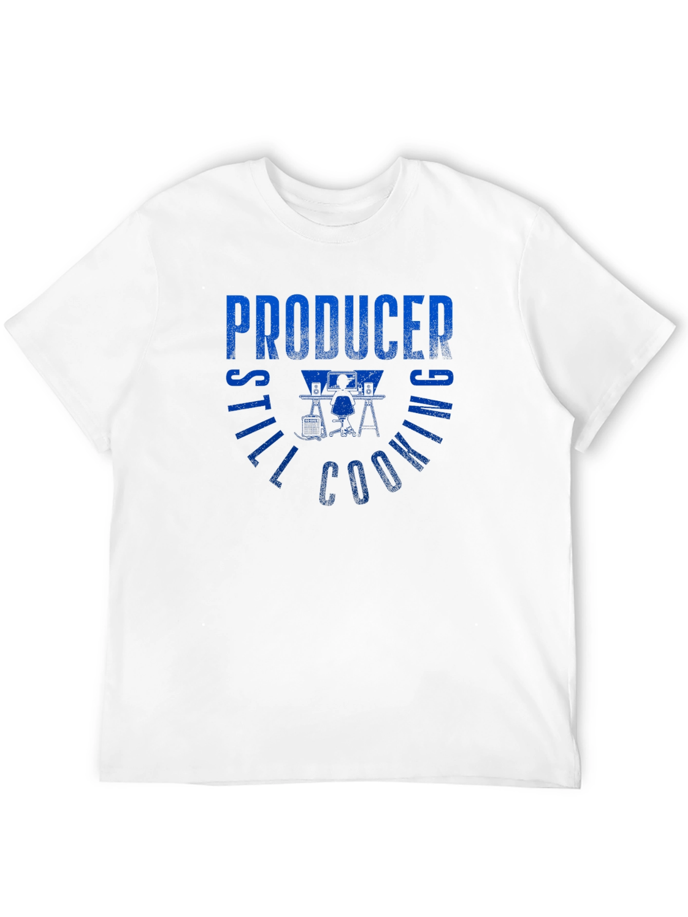 This black t-shirt features a bold, distressed-style blue graphic that proclaims "PRODUCER" above a circular design. Inside the circle is a workstation setup with a chair and equipment, above the words "STILL COOKING." The shirt has a classic crew neck and short sleeves, making it a comfortable and stylish choice for everyday wear. Show off your passion for producing with this unique and eye-catching t-shirt! Perfect for casual outings, studio sessions, or as a gift for the music producer in your life.