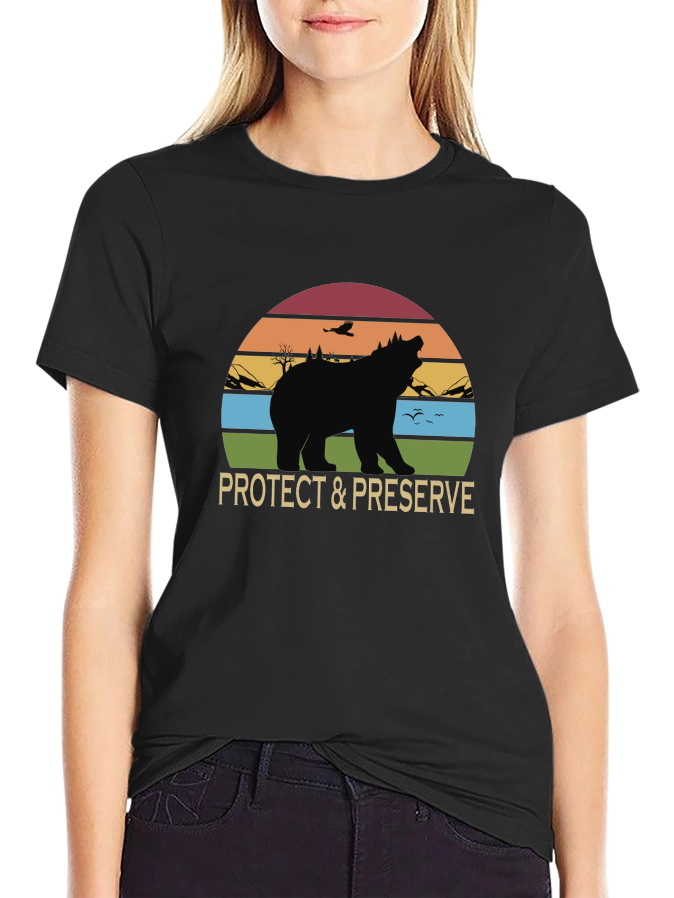 Show your love for nature with this striking black t-shirt. The design features a silhouetted bear, trees, and birds against a vintage-style sunset background with stripes of orange, yellow, green, and blue. The phrase "PROTECT & PRESERVE" is printed in a bold, golden font. Made from comfortable fabric, this tee is perfect for casual wear, outdoor adventures, or making a statement about environmental conservation. Wear it with pride and inspire others to protect our planet. A great gift for nature lovers and conservationists!