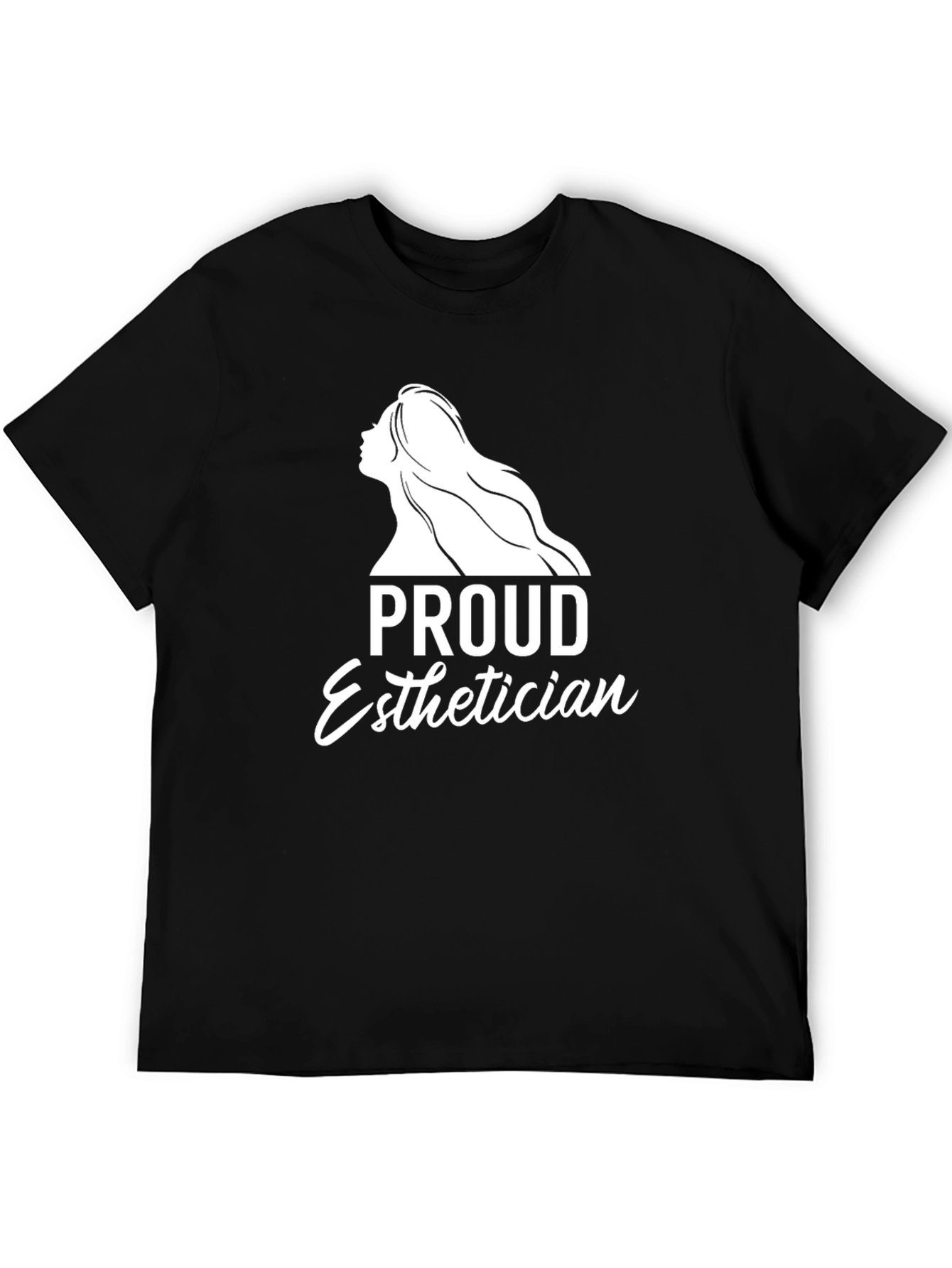 Show off your passion with this stylish black t-shirt! Featuring a bold graphic design that includes the words "Proud Esthetician" alongside a silhouette of a woman. Made from comfortable fabric, this tee is perfect for wearing to work, casual outings, or simply lounging at home. This shirt will let everyone know you are proud of your career. A great gift for your favorite esthetician!