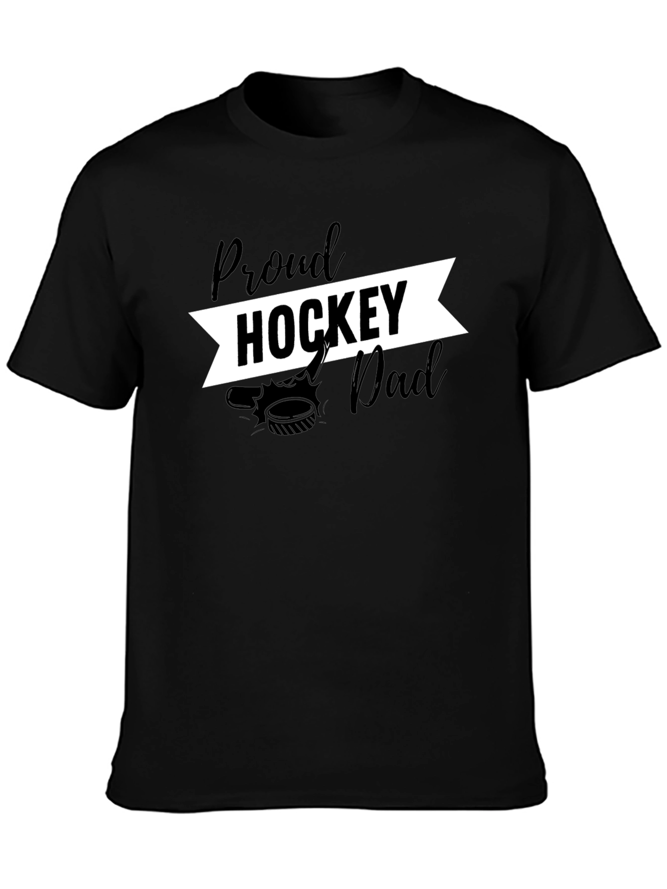 Show your love for hockey and your role as a supportive dad with this stylish black graphic t-shirt. The shirt features a bold "Proud Hockey Dad" design, complete with a hockey puck graphic. Made from comfortable fabric, this t-shirt is perfect for casual wear, game days, or showing off your hockey parent pride. It's a great gift idea for any hockey-loving father. This tee combines comfort and style, making it a must-have for any proud hockey dad's wardrobe.
