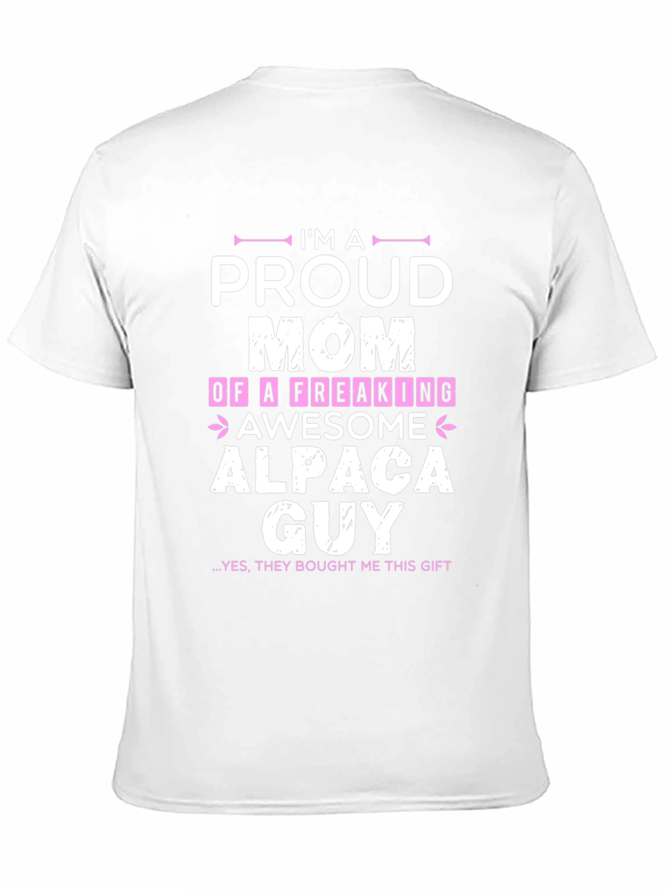 Show off your pride with this eye-catching black t-shirt! Featuring the playful text "I'M A PROUD MOM OF A FREAKING AWESOME ALPACA GUY ...YES, THEY BOUGHT ME THIS GIFT," this shirt is sure to bring smiles. The design incorporates a mix of white and pink text, creating a fun and vibrant look. Made from a comfortable fabric, this tee is perfect for casual wear, family outings, or as a humorous gift for an alpaca-loving mom. Get yours today and wear your alpaca pride with style!
