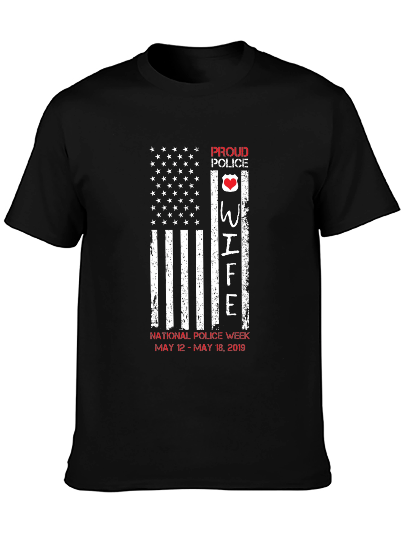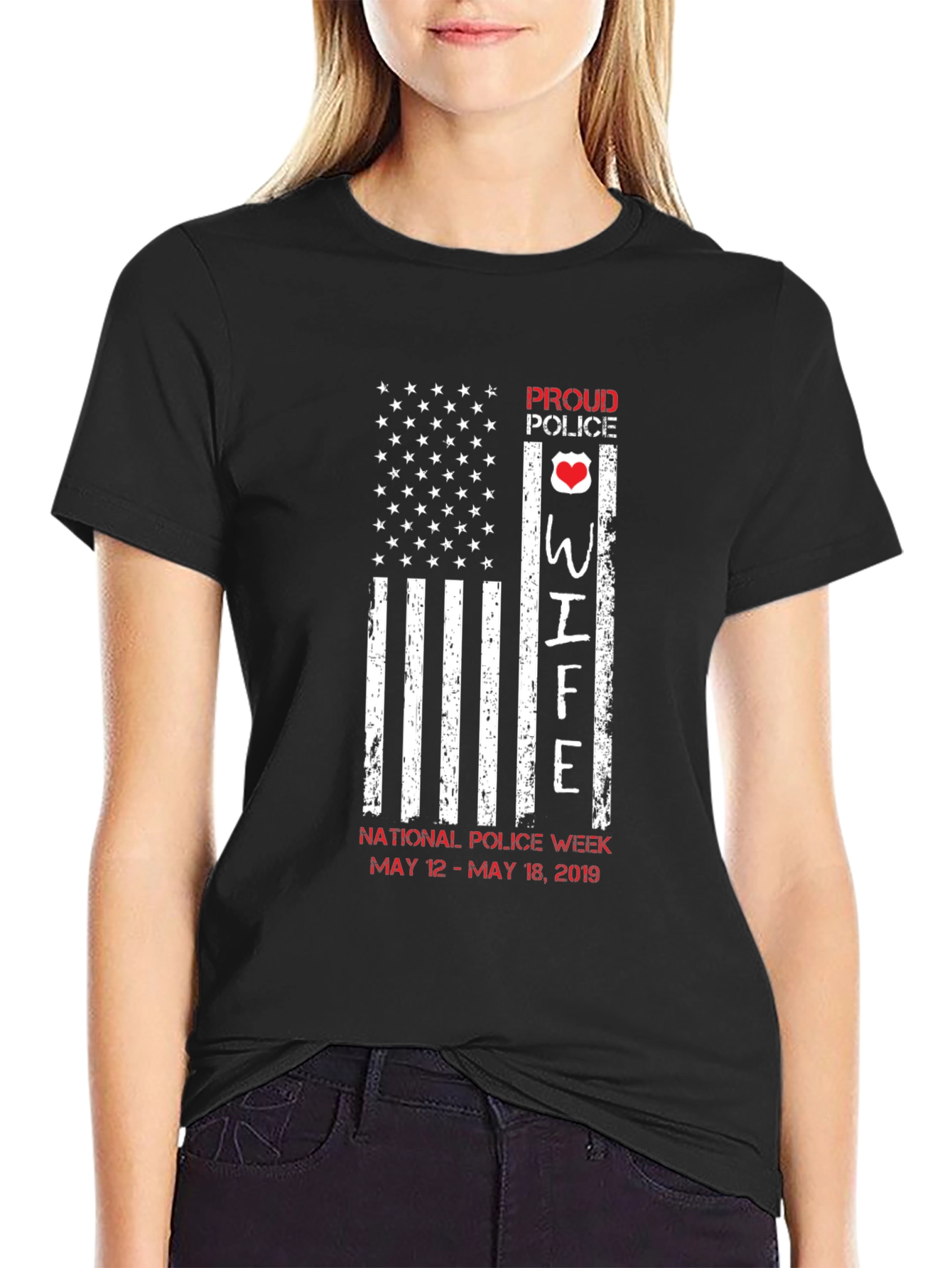 Show your support for your police officer spouse with this striking black t-shirt. The design features a distressed American flag graphic with white stars and stripes. Superimposed on the flag is the phrase "Proud Police Wife," with a heart incorporated into the design. Below, the shirt reads "National Police Week May 12 - May 18, 2019". Made from a comfortable material, this t-shirt is ideal for casual wear, police support events, or as a thoughtful gift for the proud police wife in your life. Show your support and make a statement with this meaningful piece.