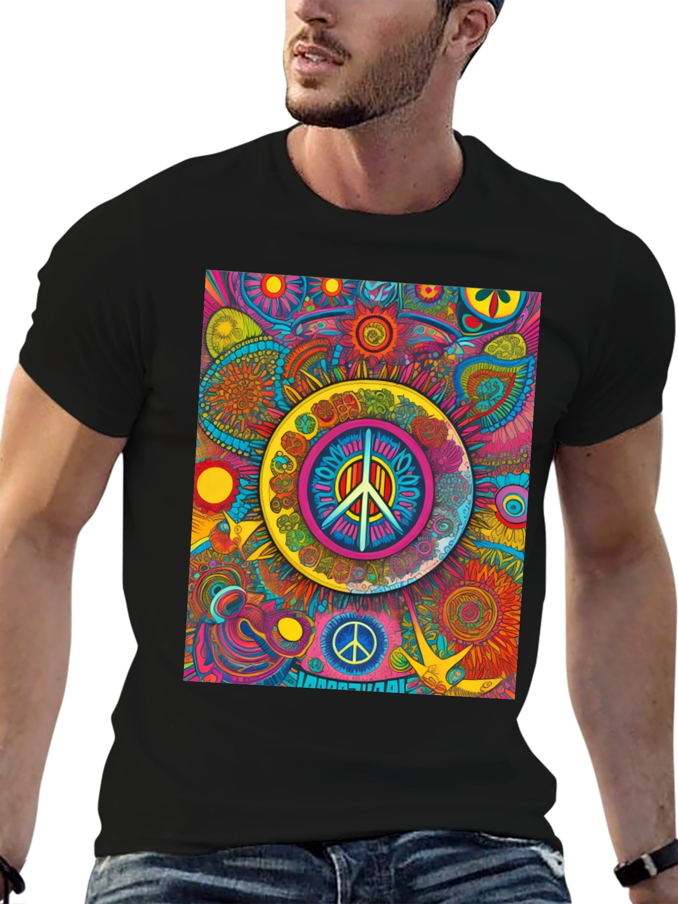 Step into a world of vibrant expression with this eye-catching graphic tee. The shirt features a stunning, psychedelic peace sign design, bursting with kaleidoscopic colors and intricate floral patterns. This bold, colorful print is sure to turn heads and make a statement. Made from a comfortable, dark-colored fabric, this t-shirt is perfect for everyday wear, festivals, or expressing your unique style. Embrace the spirit of peace and love with this groovy, artistic tee.