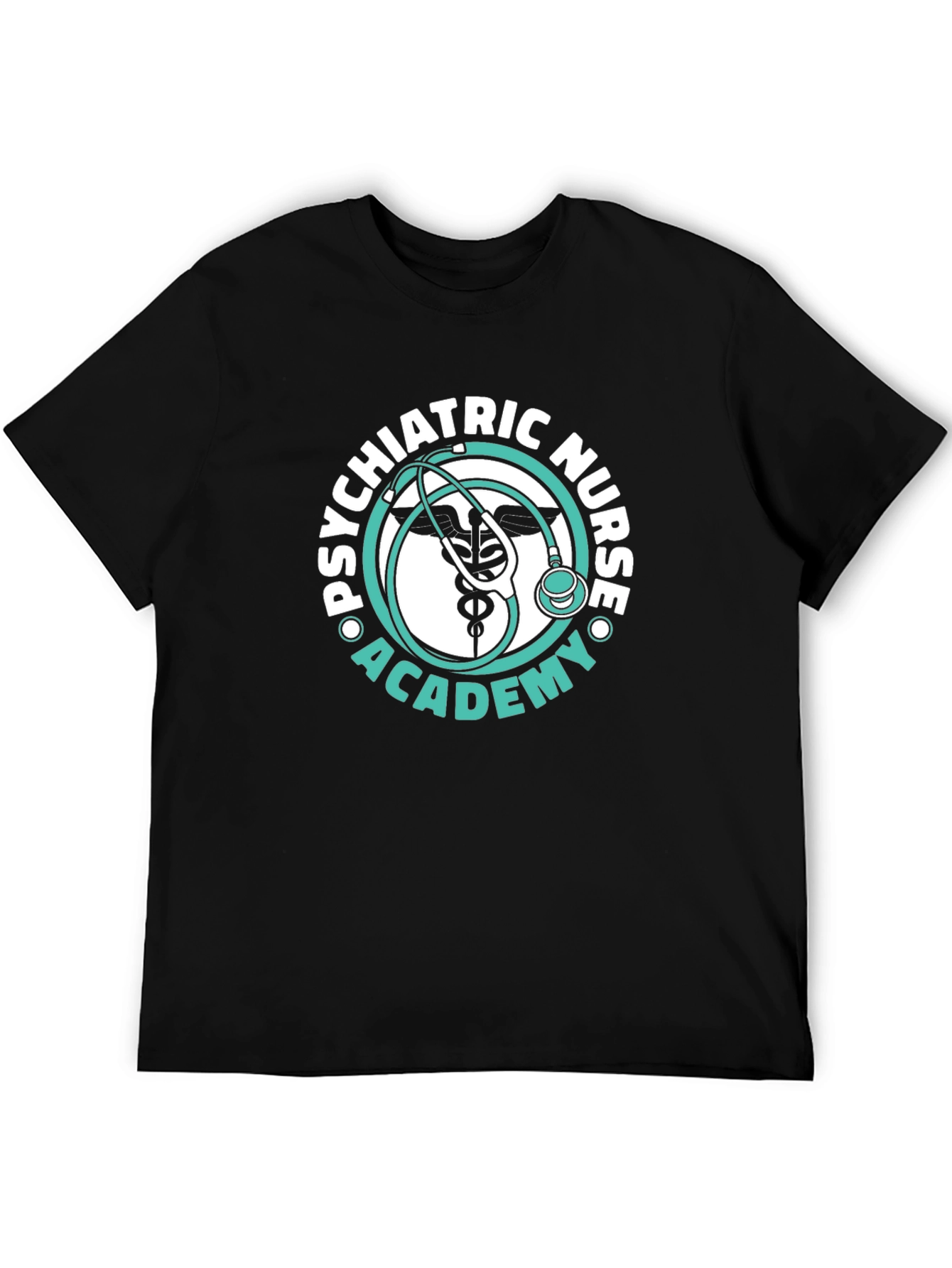 Showcase your passion with this striking black t-shirt. Featuring a captivating "Psychiatric Nurse Academy" logo design, encircled by a medical caduceus and stethoscope, this tee is perfect for nurses or students in the psychiatric field. Made from a comfortable, breathable fabric, it’s ideal for everyday wear, campus life, or medical conferences. The design is printed with durable, high-quality ink, ensuring long-lasting vibrancy and a professional look. Whether you're heading to a study session or a hospital shift, this t-shirt proudly displays your dedication to mental health care.