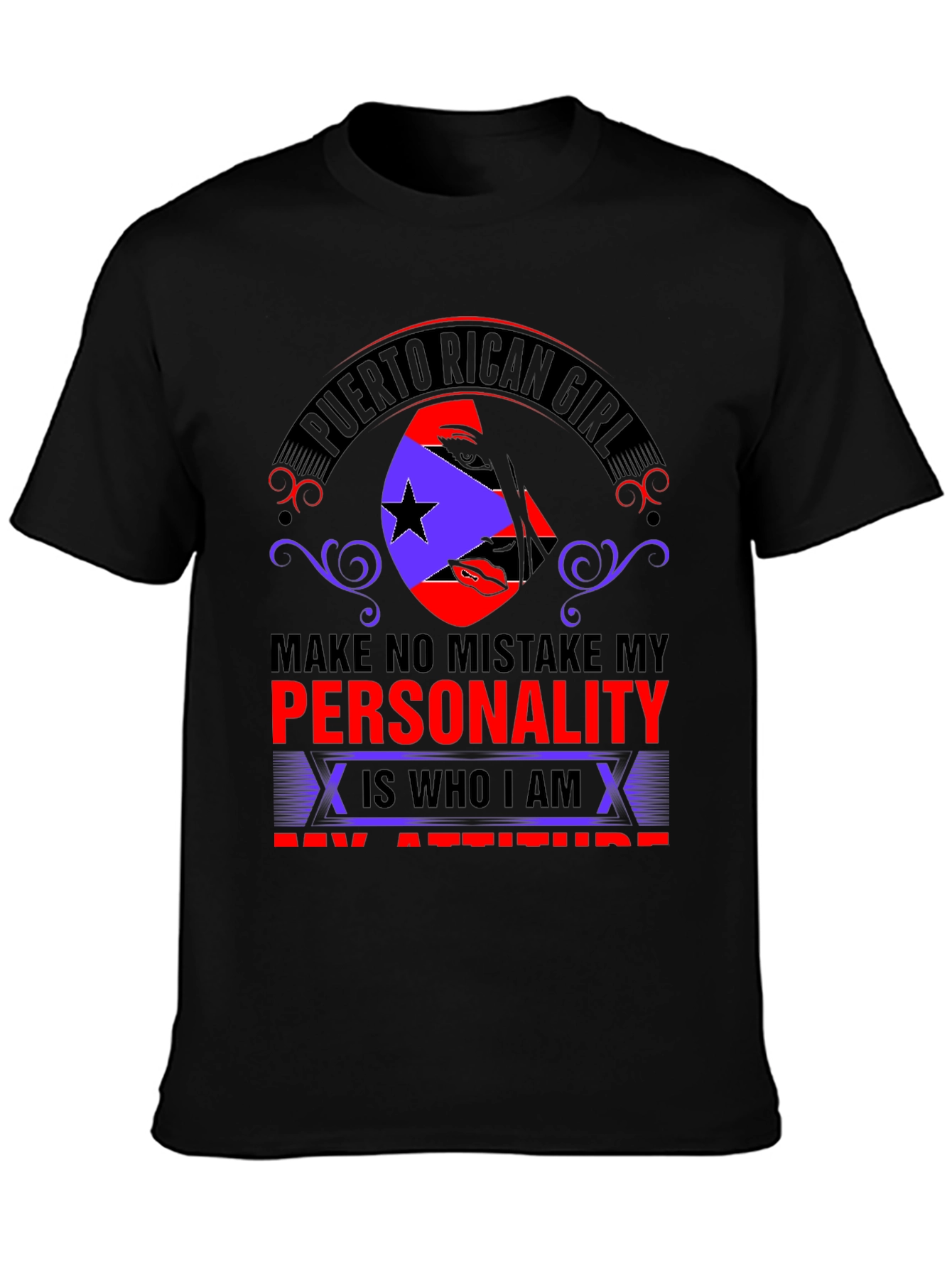 Showcase your Puerto Rican pride with this bold and stylish black t-shirt! The eye-catching design features the words "PUERTO RICAN GIRL" around a striking graphic incorporating the Puerto Rican flag. Below, the statement "MAKE NO MISTAKE MY PERSONALITY IS WHO I AM MY ATTITUDE" is prominently displayed, emphasizing confidence and self-assurance. The graphic utilizes vibrant red and purple accents, adding a touch of flair to the design. Made from a comfortable and durable fabric, this t-shirt is perfect for casual wear, cultural events, or as a statement piece to express your heritage and individuality. Let your personality shine with this unique and empowering t-shirt!