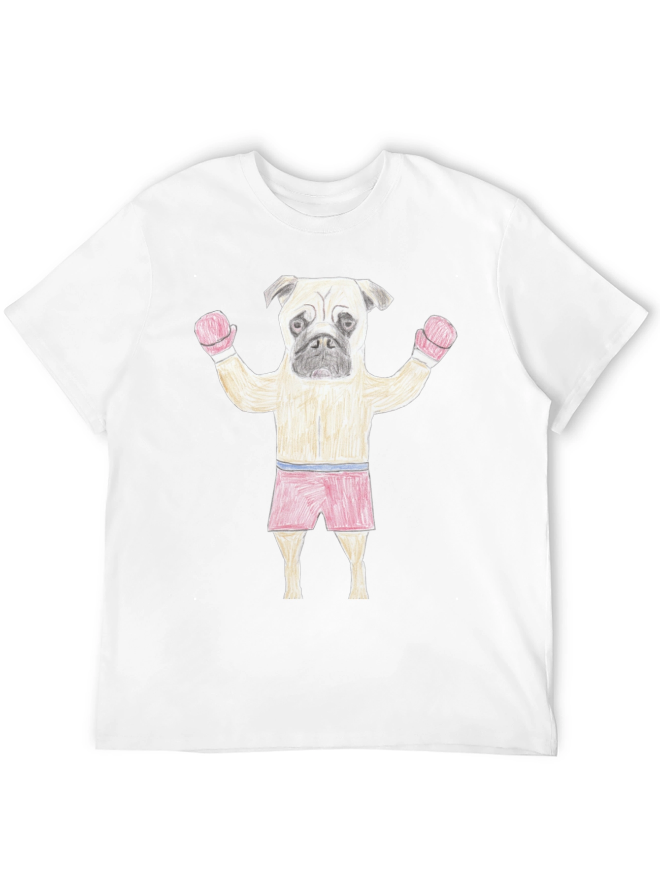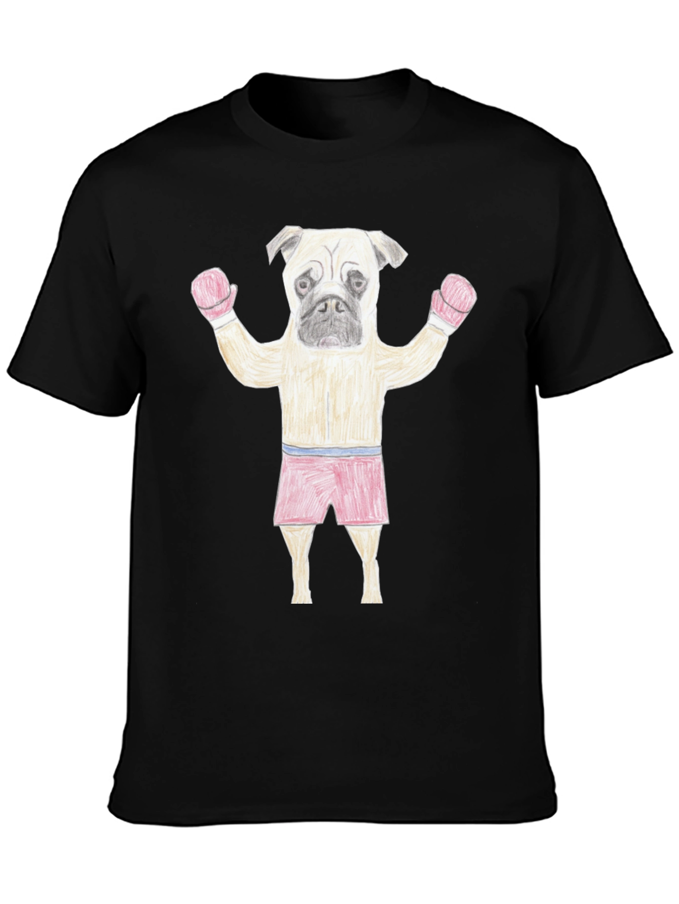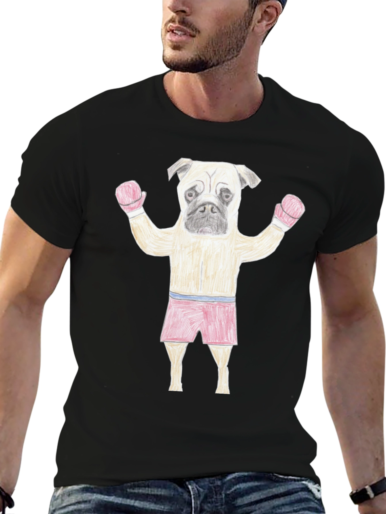 Show off your playful side with this unique black t-shirt featuring a hand-drawn style illustration of a pug boxer. The design showcases a pug standing upright, wearing pink boxing gloves and pink shorts, ready to take on the world. The adorable and whimsical artwork adds a touch of humor and personality to your wardrobe. Crafted from a comfortable and durable fabric, this tee is perfect for everyday wear. Whether you're hitting the gym, hanging out with friends, or just lounging at home, this pug boxer t-shirt is sure to make a statement. A great conversation starter and a must-have for dog lovers!