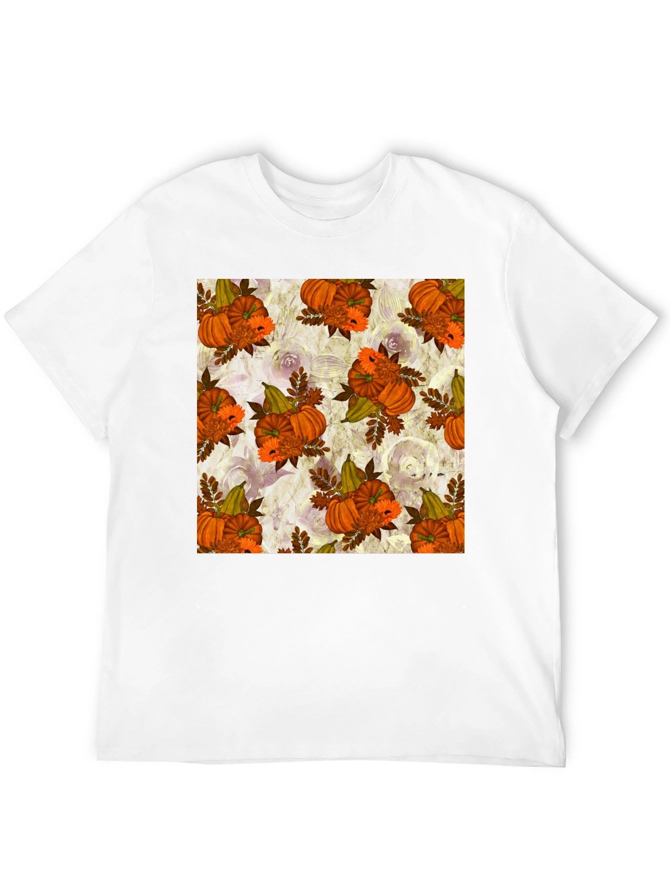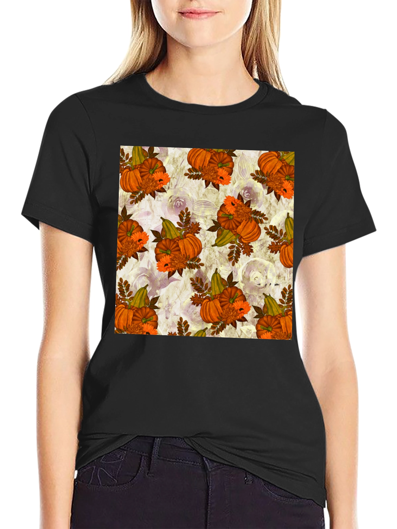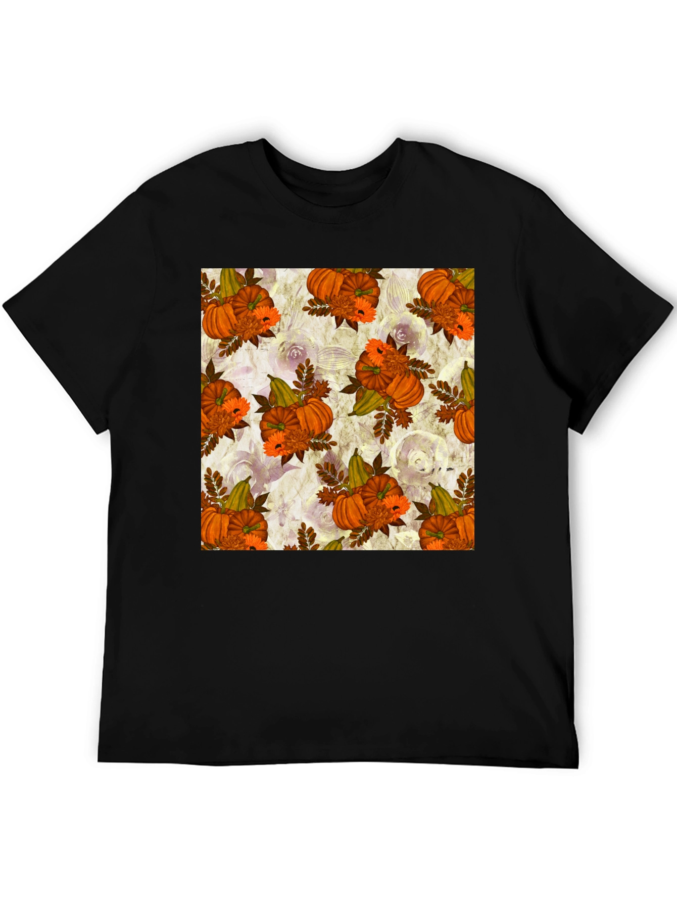 Embrace autumn vibes with this eye-catching black t-shirt, featuring a vibrant pumpkin and floral print. The square design pops against the dark fabric, creating a bold statement piece. Perfect for casual wear, fall festivals, or adding a touch of seasonal charm to your everyday style. Made from comfortable fabric, this tee offers a relaxed fit for all-day comfort. Whether you're strolling through a pumpkin patch or simply enjoying a cozy day indoors, this t-shirt is sure to bring a smile to your face and capture the spirit of the season. Update your wardrobe with this unique seasonal design!