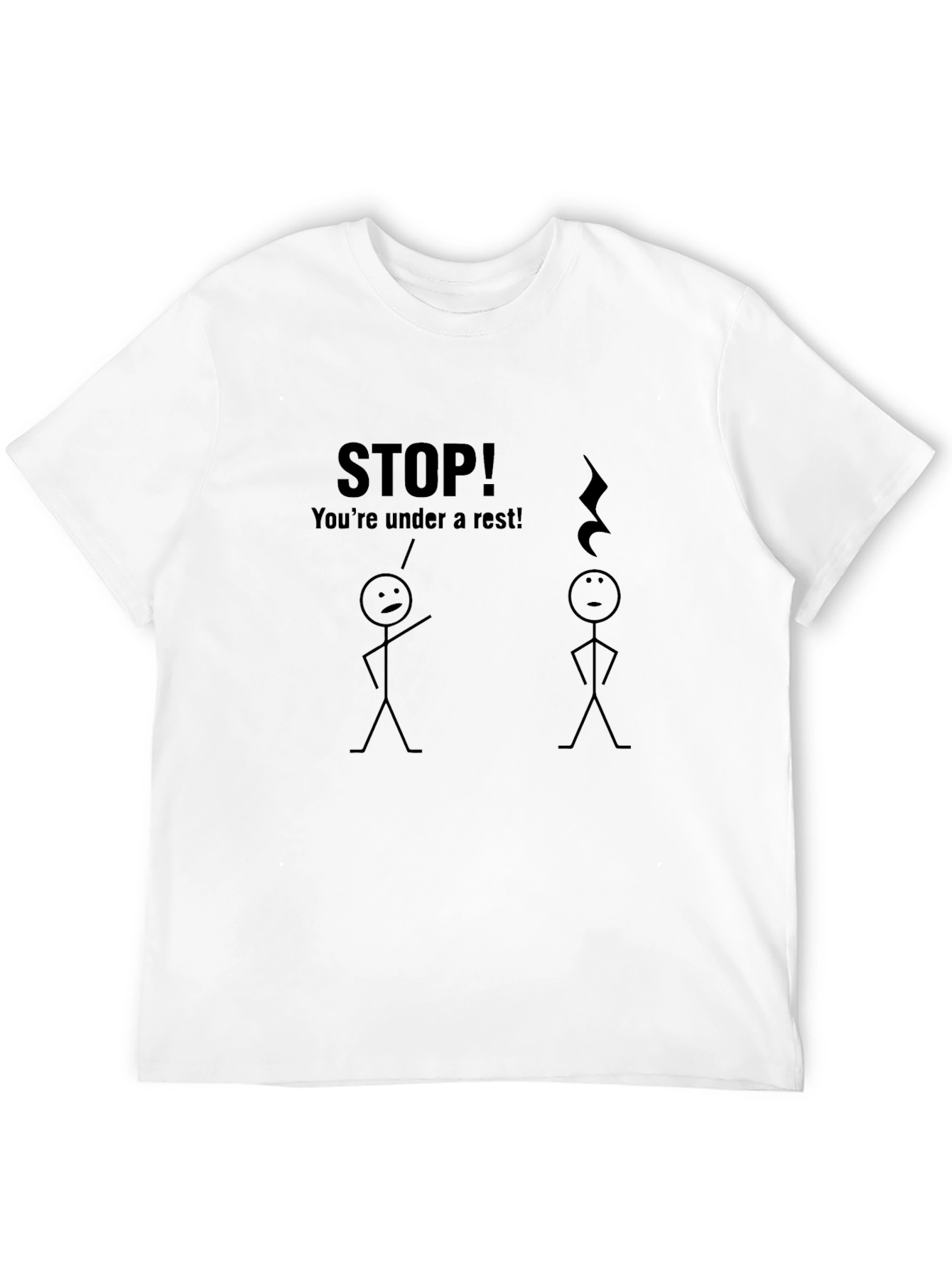 This black t-shirt features a clever music-themed pun. The design includes stick figure drawings with the words 'STOP! You're under a rest!' The graphic playfully incorporates a musical rest symbol, creating a funny visual gag. Made from what appears to be soft cotton, this tee looks comfortable and durable. It's a great conversation starter for music lovers, musicians, or anyone with a good sense of humor. Perfect for casual wear, concerts, or music-themed events, this unique t-shirt is sure to get a laugh.
