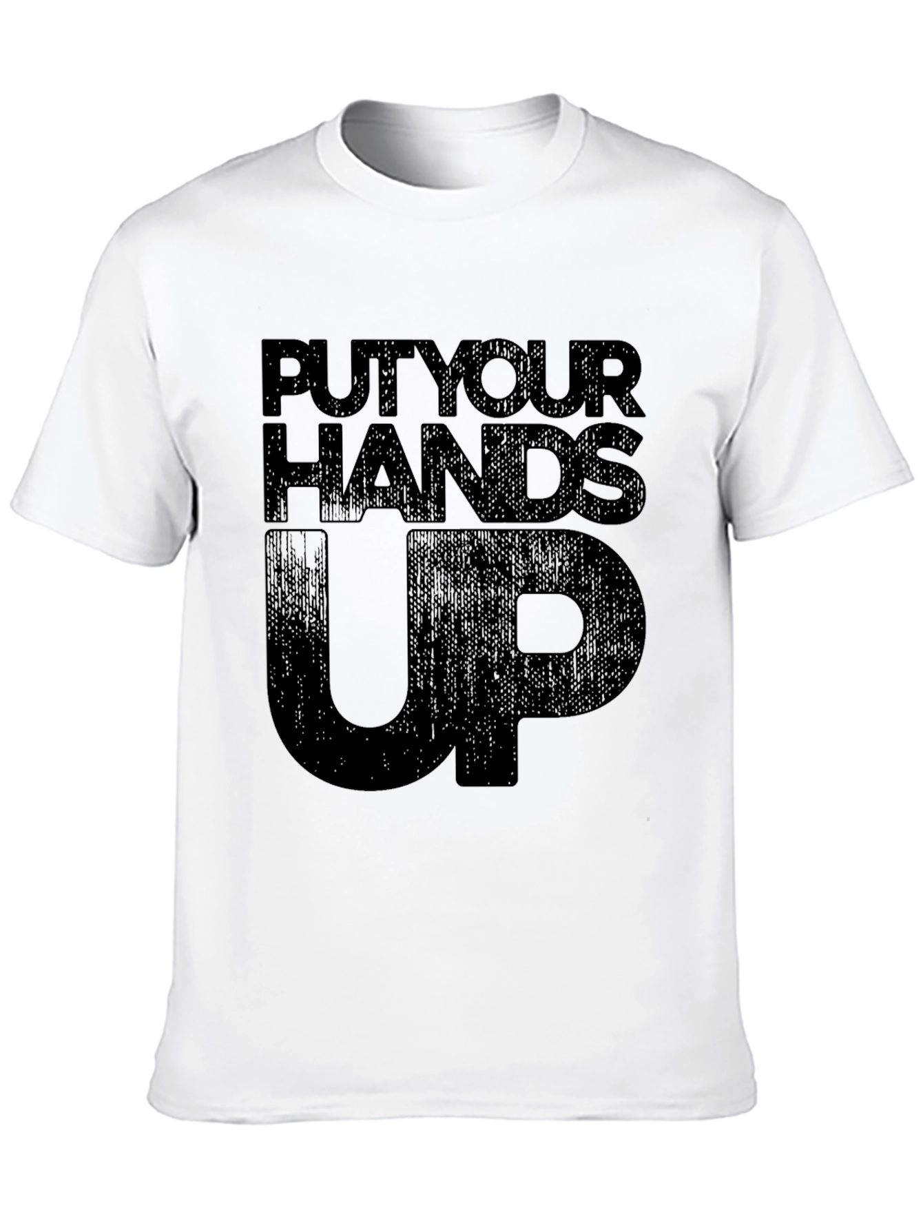 Make a statement with this bold black graphic tee. Featuring the text "PUT YOUR HANDS UP" in a striking, shadowed font, this shirt is sure to turn heads. The classic crew neck and short sleeves offer a comfortable fit, perfect for everyday wear. Whether you're hitting the streets or hanging out with friends, this tee adds an edgy vibe to any outfit. Show off your unique style and confidence with this eye-catching design. A must-have for anyone looking to stand out from the crowd and express their individuality. Get yours today and make a bold statement!