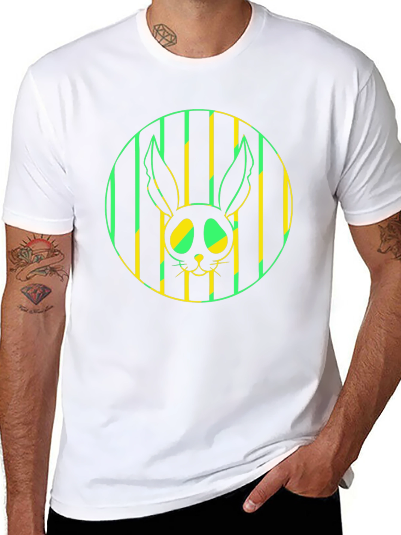 Show off your unique style with this striking black t-shirt. Featuring a distinctive rabbit graphic design in vibrant green and yellow against a striped circle, this tee is perfect for casual wear. Crafted from a soft, comfortable fabric, it provides a relaxed fit for all-day comfort. The eye-catching design makes it a great conversation starter and a stylish addition to any wardrobe. Ideal for everyday wear, concerts, or expressing your individual style.
