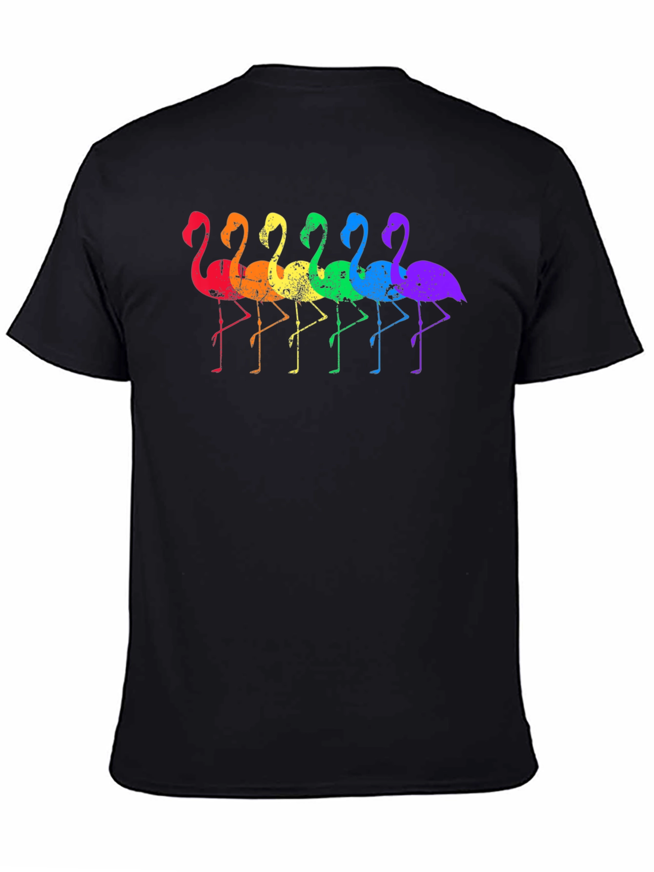 Show your pride with this eye-catching black cotton T-shirt featuring a vibrant rainbow flamingo graphic. The design showcases a row of flamingos in a spectrum of colors, creating a fun and expressive statement piece. Made from comfortable, breathable cotton, this tee is perfect for everyday wear. Whether you're heading to a pride event, lounging at home, or just want to add a splash of color to your outfit, this shirt is a great choice. The classic fit and durable fabric ensure long-lasting comfort and style. Stand out from the crowd and let your personality shine with this unique and colorful tee.