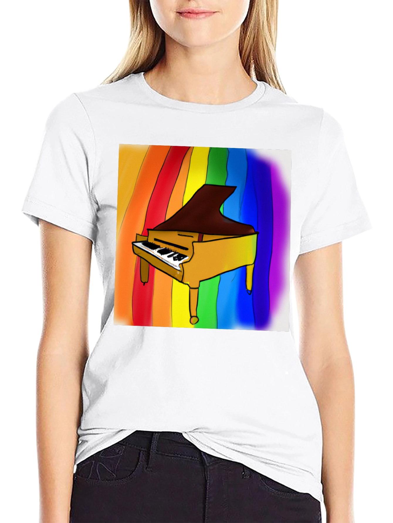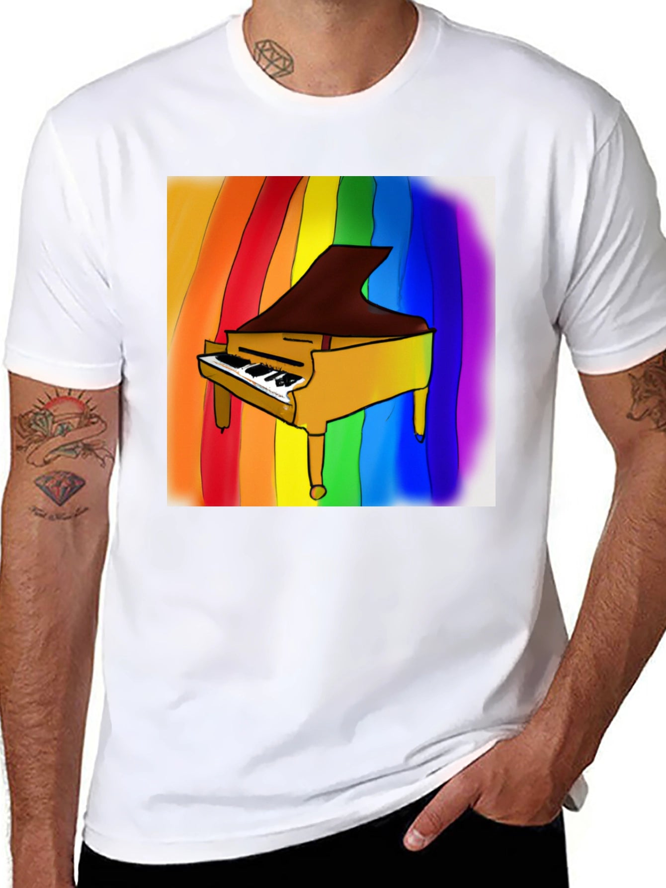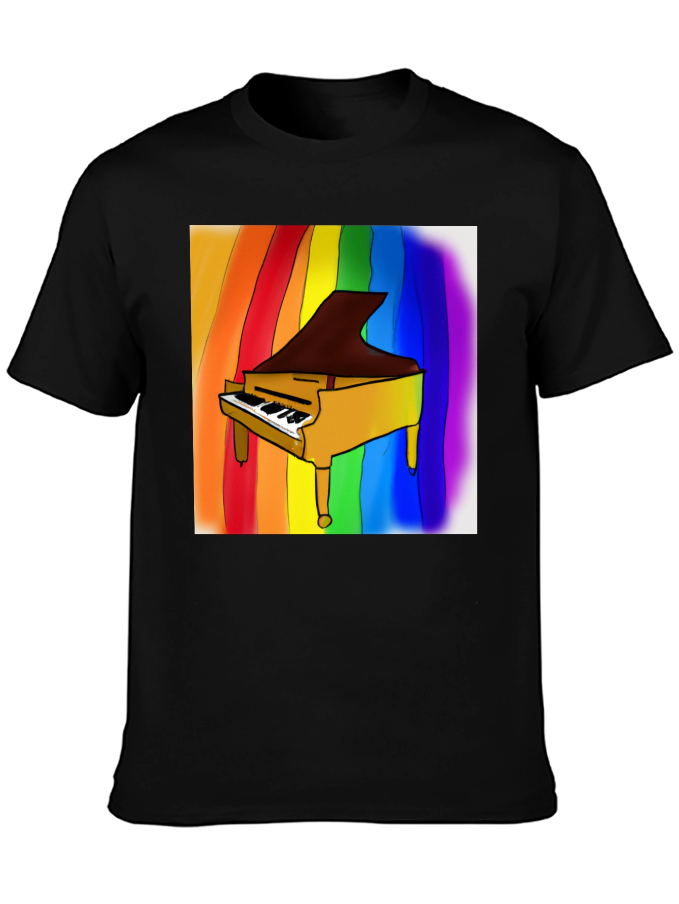 Show off your love for music with this vibrant black t-shirt! Featuring a unique graphic of a grand piano set against a colorful rainbow background, this shirt is sure to turn heads. Made from a soft and comfortable cotton blend, this tee is perfect for everyday wear, music festivals, or casual outings. The eye-catching design is ideal for musicians, piano enthusiasts, and anyone who appreciates artistic flair. Express your passion for music and stand out from the crowd with this stylish and comfortable t-shirt. It is a perfect gift for any musician. Available in various sizes.