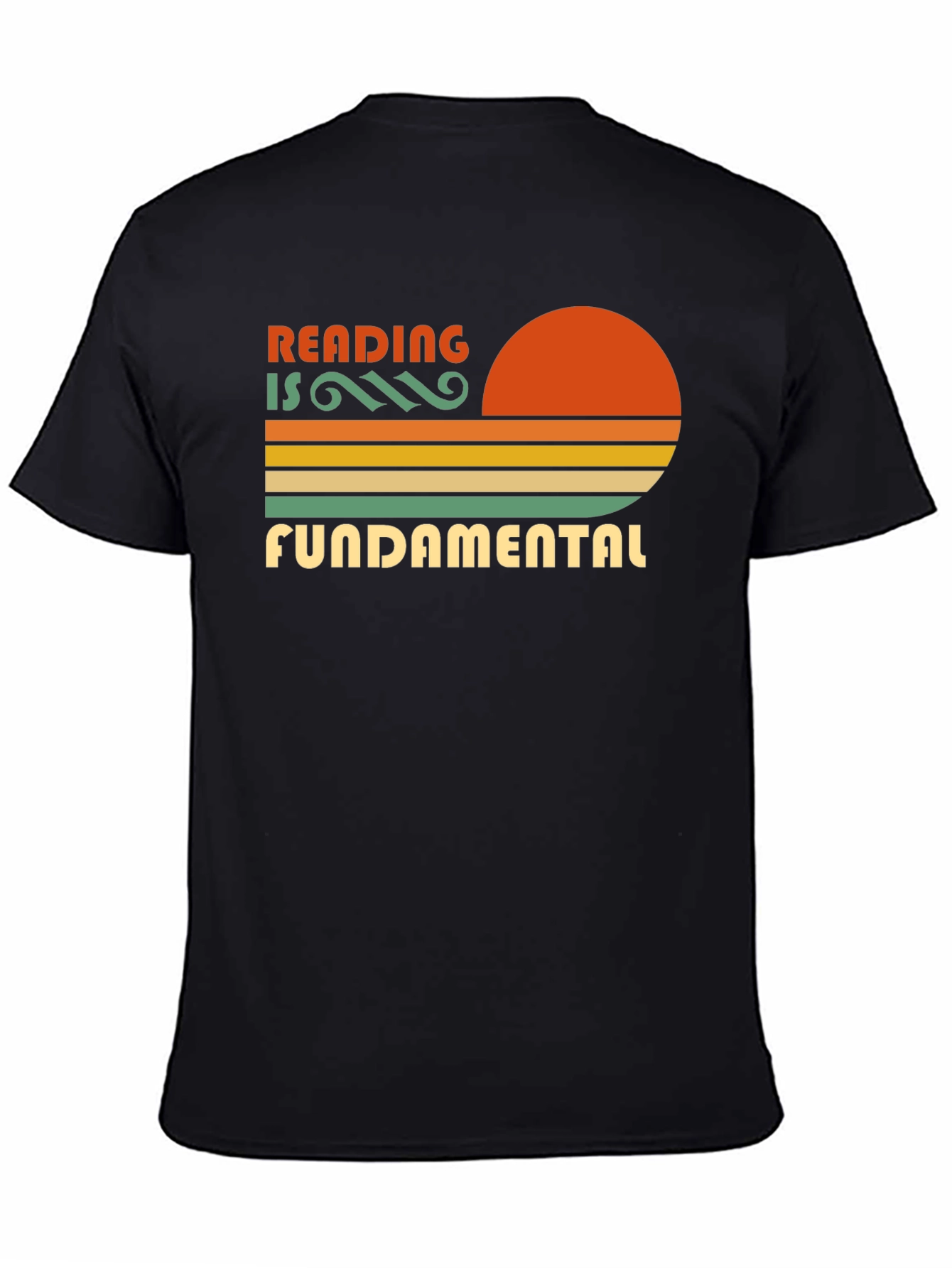 Embrace a love for reading with this eye-catching graphic tee! Featuring a retro-inspired sunset design, the shirt boldly proclaims "Reading is Fundamental" in a vintage font. The graphic consists of orange, yellow, and green horizontal stripes under the word "Reading", with the word "Fundamental" below. Made from a soft, breathable fabric, this black tee offers both comfort and style. Perfect for educators, bookworms, or anyone who values literacy, this T-shirt is ideal for casual wear, library visits, or sparking conversations about the importance of reading. A timeless piece that combines fashion with a powerful message.