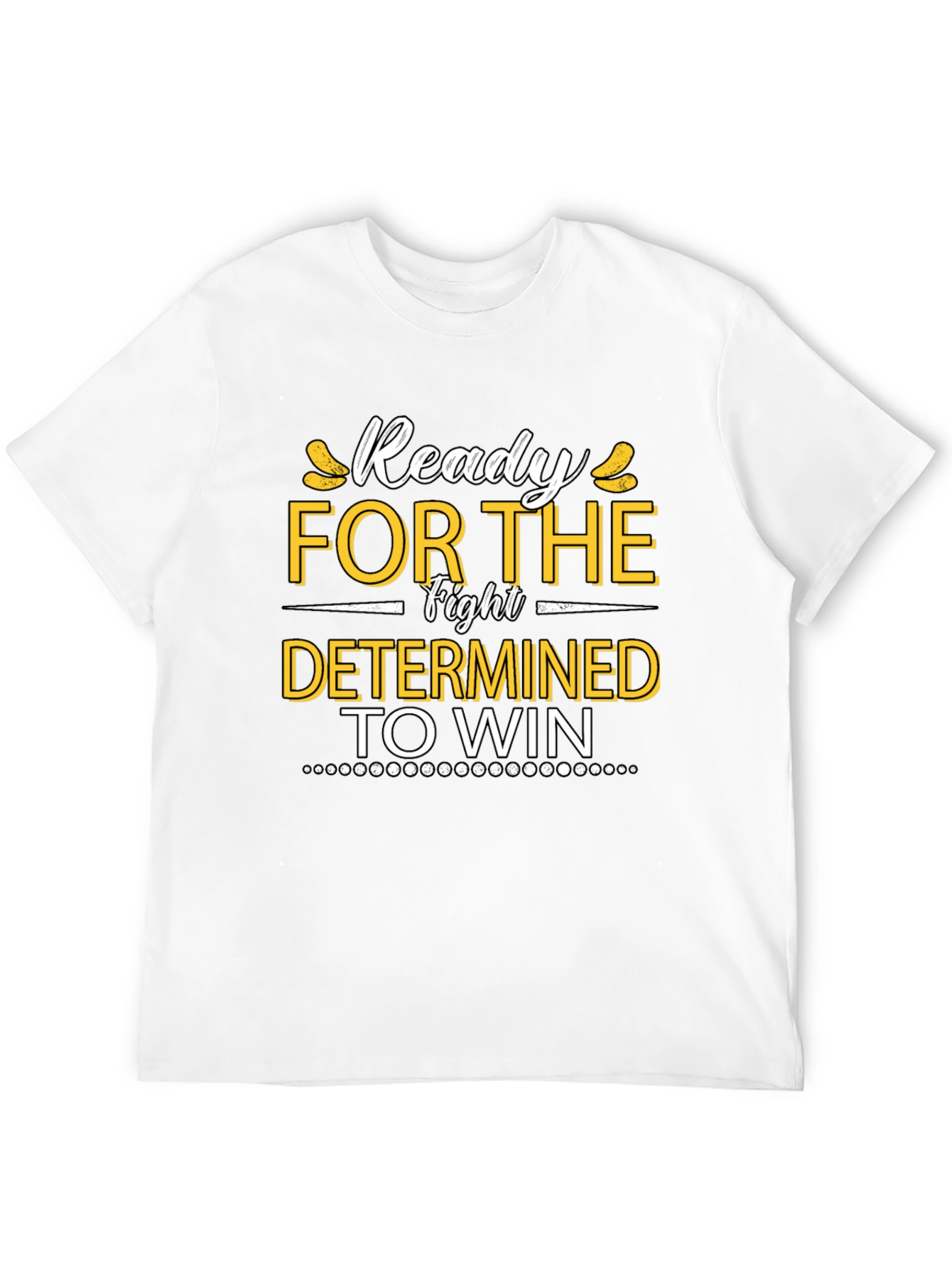 Show your determination with this bold black graphic tee! The shirt features a striking yellow and white design with the motivational message "Ready FOR THE fight DETERMINED TO WIN" in a mix of eye-catching fonts. Made from a soft, comfortable fabric, this tee is perfect for everyday wear. Whether you're hitting the gym, running errands, or just relaxing at home, this shirt will keep you feeling inspired and looking stylish. Make a statement and declare your commitment to success!