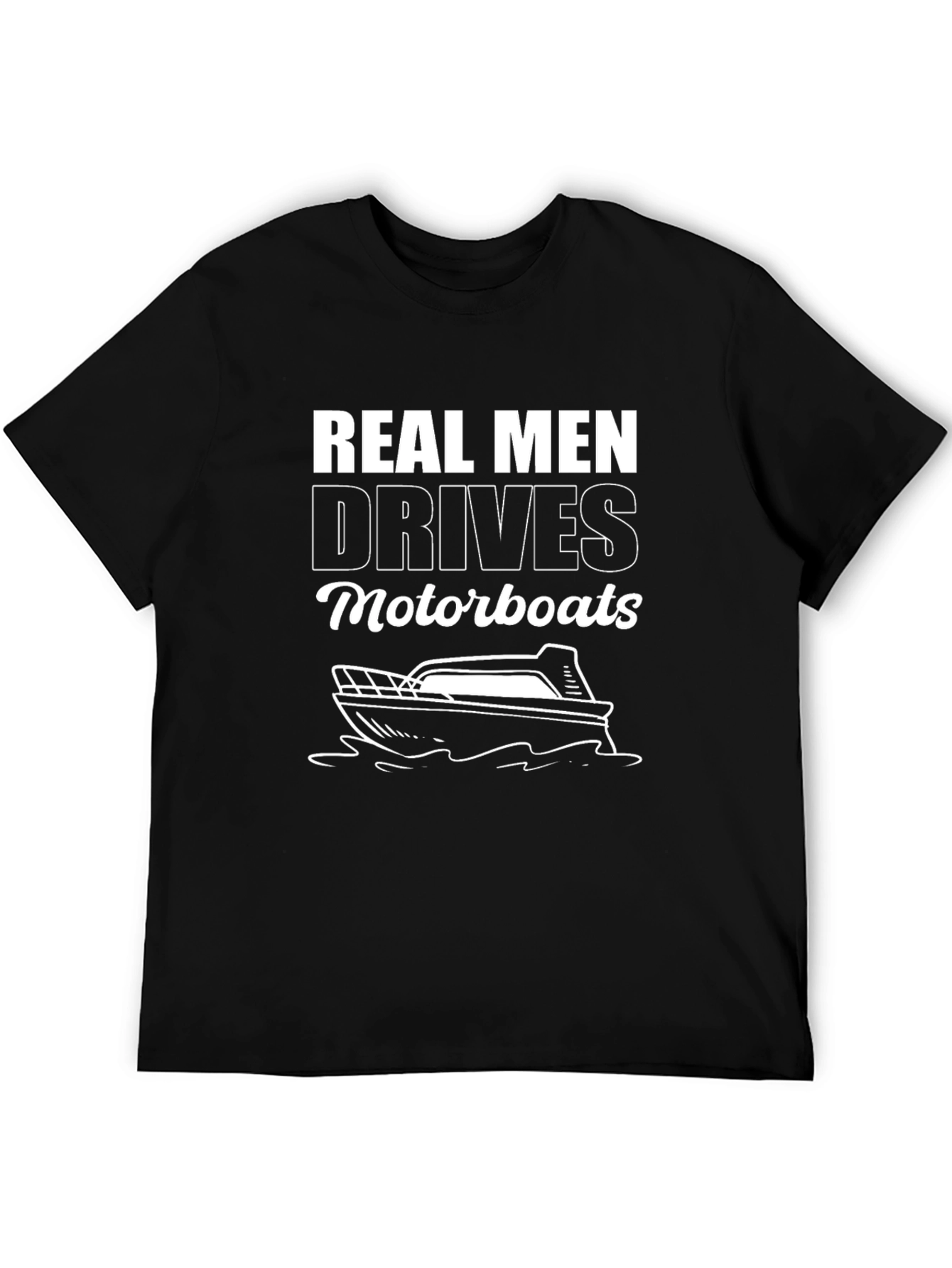 Showcase your love for boating with this stylish black t-shirt! Featuring a bold white graphic design that reads "REAL MEN DRIVES Motorboats" above a sleek motorboat illustration, this tee is perfect for boating enthusiasts and those who appreciate a touch of humor. Crafted from a comfortable-looking fabric, it offers a relaxed fit suitable for everyday wear. Whether you're out on the water, hanging out with friends, or just running errands, this t-shirt is a great way to express your interests and add a statement piece to your casual wardrobe. Grab yours today and let everyone know you're a proud motorboat aficionado!
