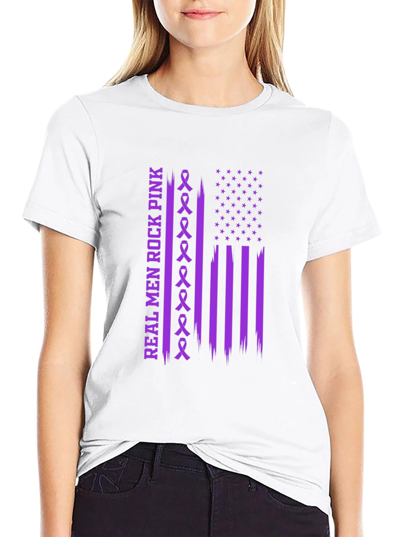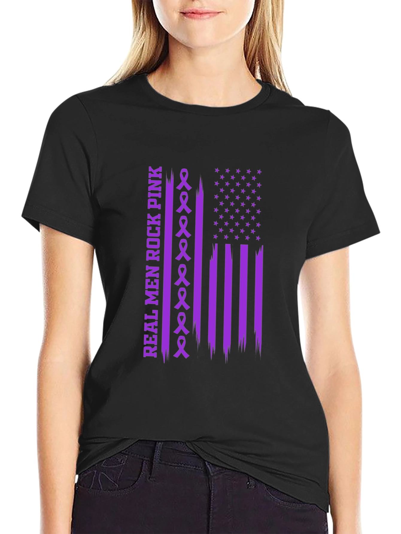 Show your support with this striking black t-shirt featuring a unique, distressed American flag design in a vibrant purple hue. The flag incorporates awareness ribbons and stars, alongside the empowering message "REAL MEN ROCK PINK". Made from a comfortable material, this tee is perfect for raising awareness and expressing solidarity. Ideal for wearing at charity events, awareness walks, or as a daily statement of support. Let your style speak volumes with this impactful and meaningful t-shirt.