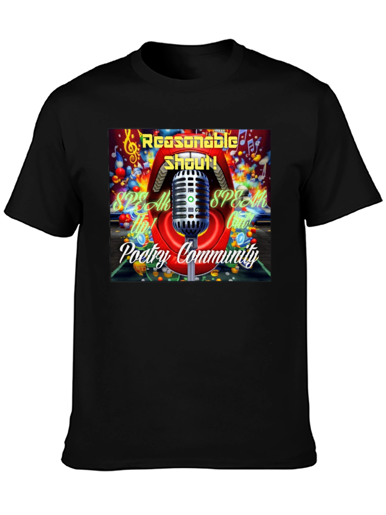 Show your love for poetry with this vibrant black t-shirt. Featuring a colorful design with a vintage-style microphone, musical notes, and the phrase "Reasonable Shout Poetry Community," this tee is perfect for poets, spoken word artists, and anyone who appreciates the art of verse. Made from a comfortable, breathable fabric, it's ideal for everyday wear, open mic nights, poetry slams, or casual outings. Let your passion for poetry shine with this unique and expressive t-shirt!