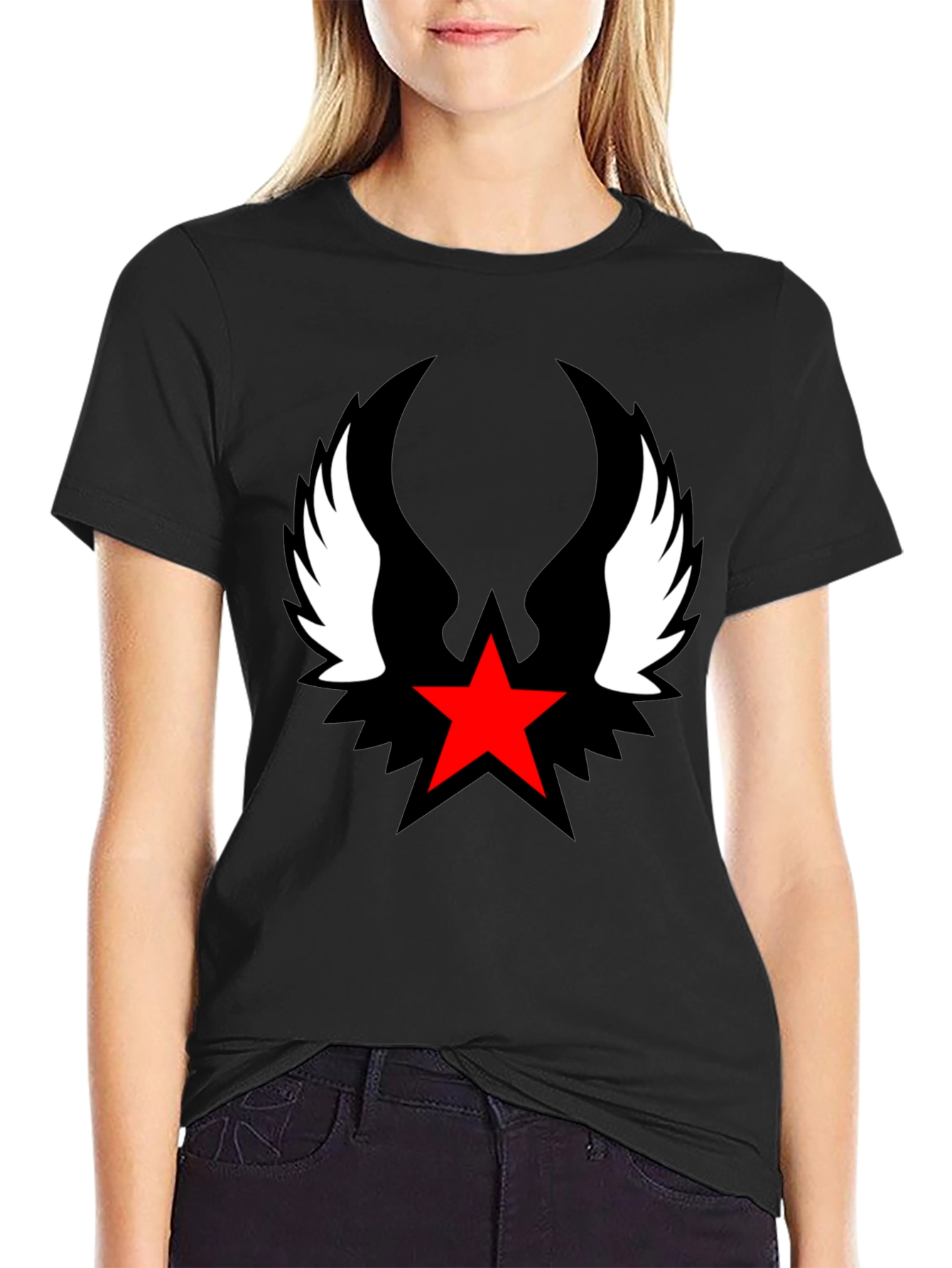 Make a bold statement with this striking black t-shirt featuring a vibrant red star graphic accented by stylized black and white wings. Crafted from comfortable, breathable fabric, this tee offers both style and comfort for everyday wear. The eye-catching design adds a touch of edgy flair to any casual outfit, making it perfect for concerts, outings with friends, or simply expressing your unique personality. Dress it up with a jacket or wear it alone for a relaxed, cool look. A must-have addition to any modern man's wardrobe.