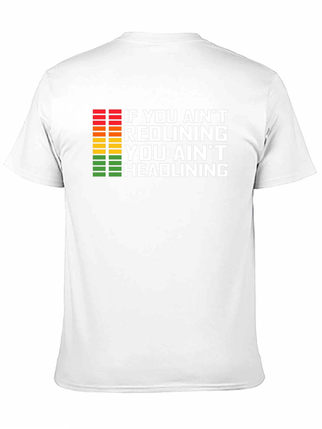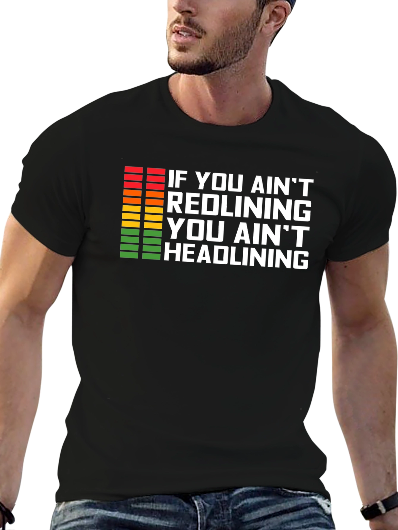 Fuel your passion with this bold graphic tee! Made from a comfortable, possibly cotton blend, this black t-shirt features a unique design with vibrant red, orange, and green bars accenting the statement: "If You Ain't Redlining You Ain't Headlining". The eye-catching design is perfect for anyone with a need for speed or a passion for performance. Show off your dedication at car meets, races, or just kicking back with friends. Get yours today and showcase your adrenaline-fueled spirit!