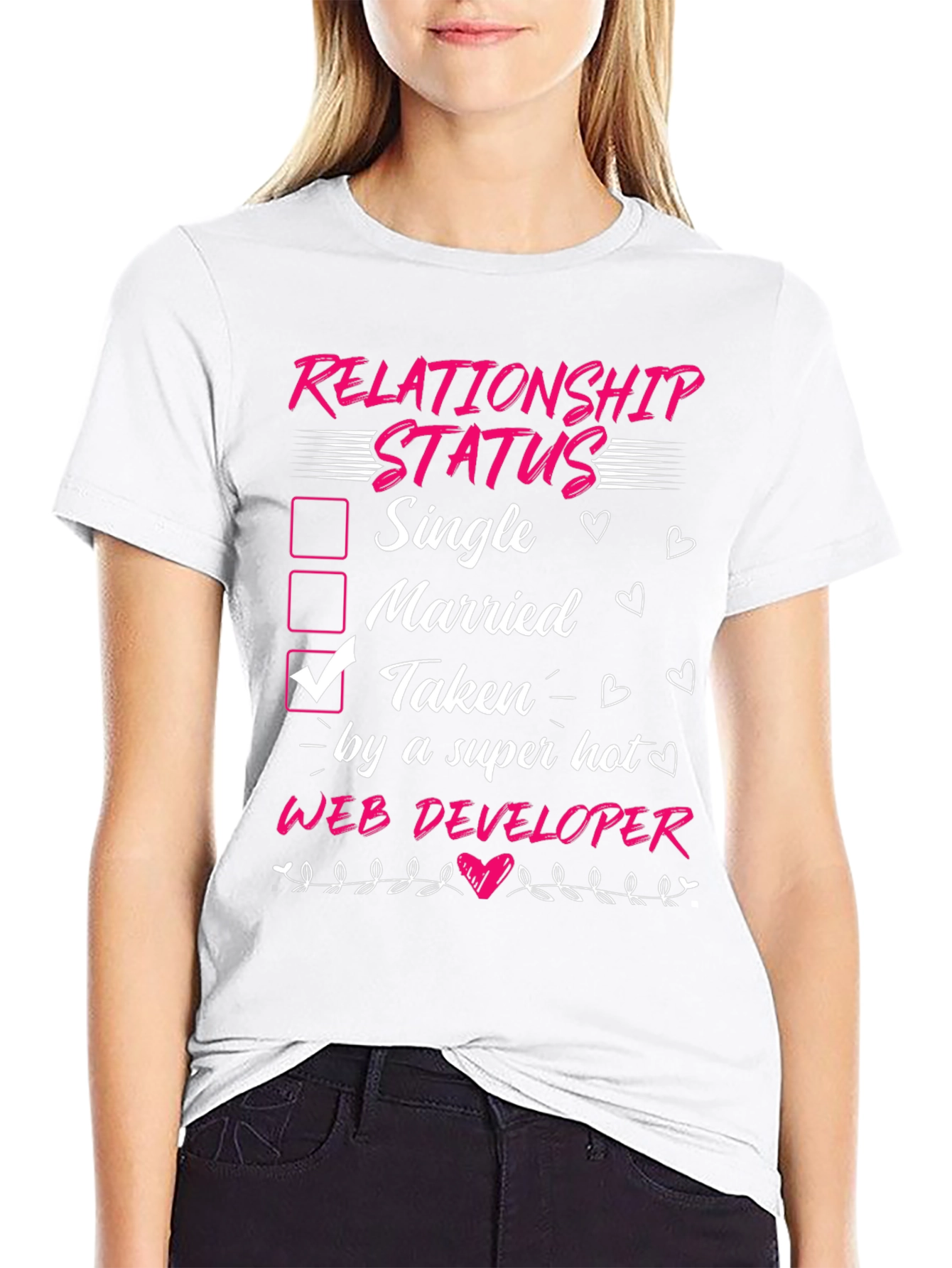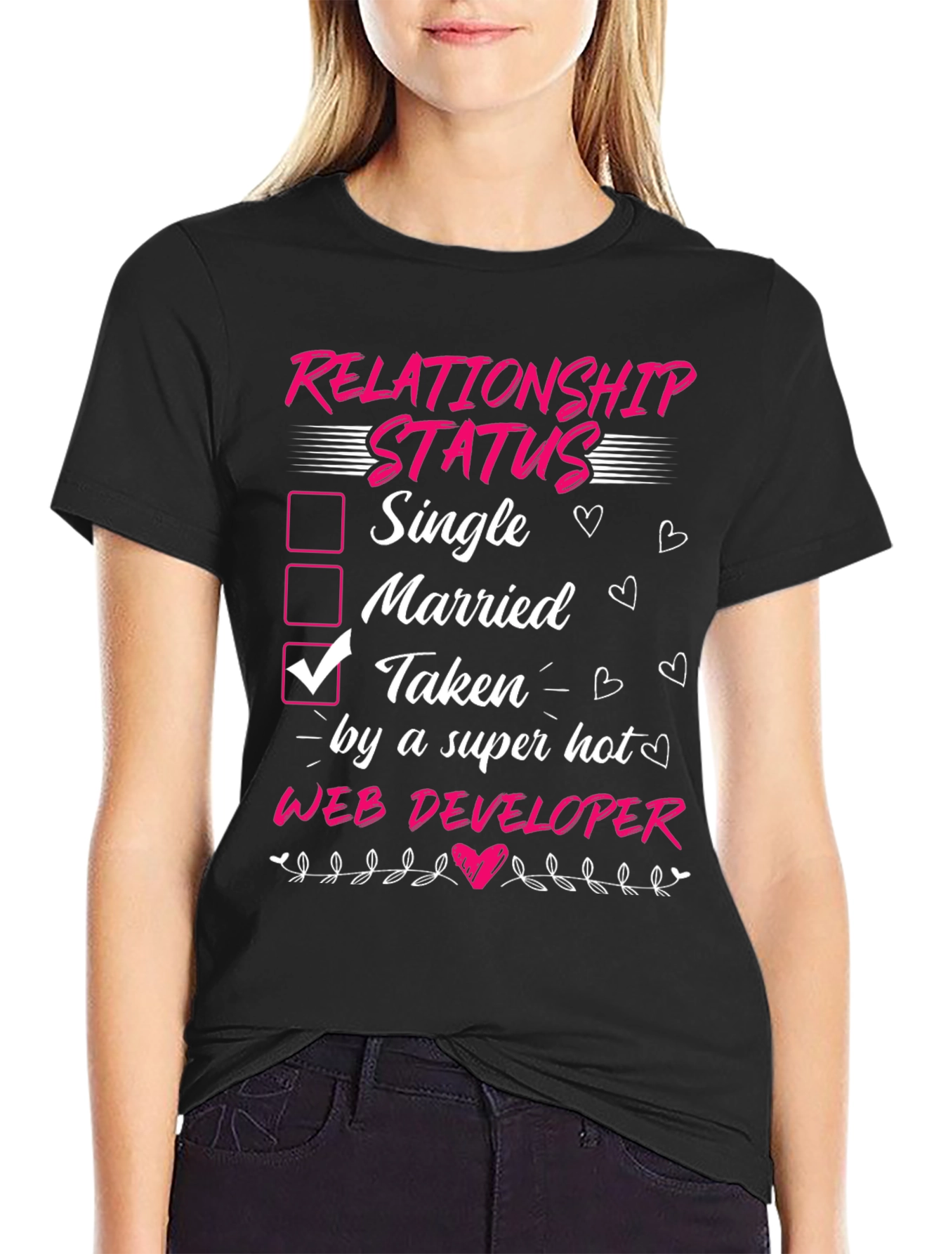 Declare your relationship status with a touch of humor in this eye-catching graphic tee. The black t-shirt features a playful design with the words 'Relationship Status' in a vibrant pink, alongside checkboxes for 'Single', 'Married', and 'Taken'. A checkmark boldly marks 'Taken', followed by 'by a super hot WEB DEVELOPER', adorned with cute heart accents. The design is completed with a flourish of leafy graphics at the bottom, adding a fun, flirty vibe. Perfect for casual wear, this tee is a great conversation starter and a fun way to express your love for your significant other. Show off your pride and passion!