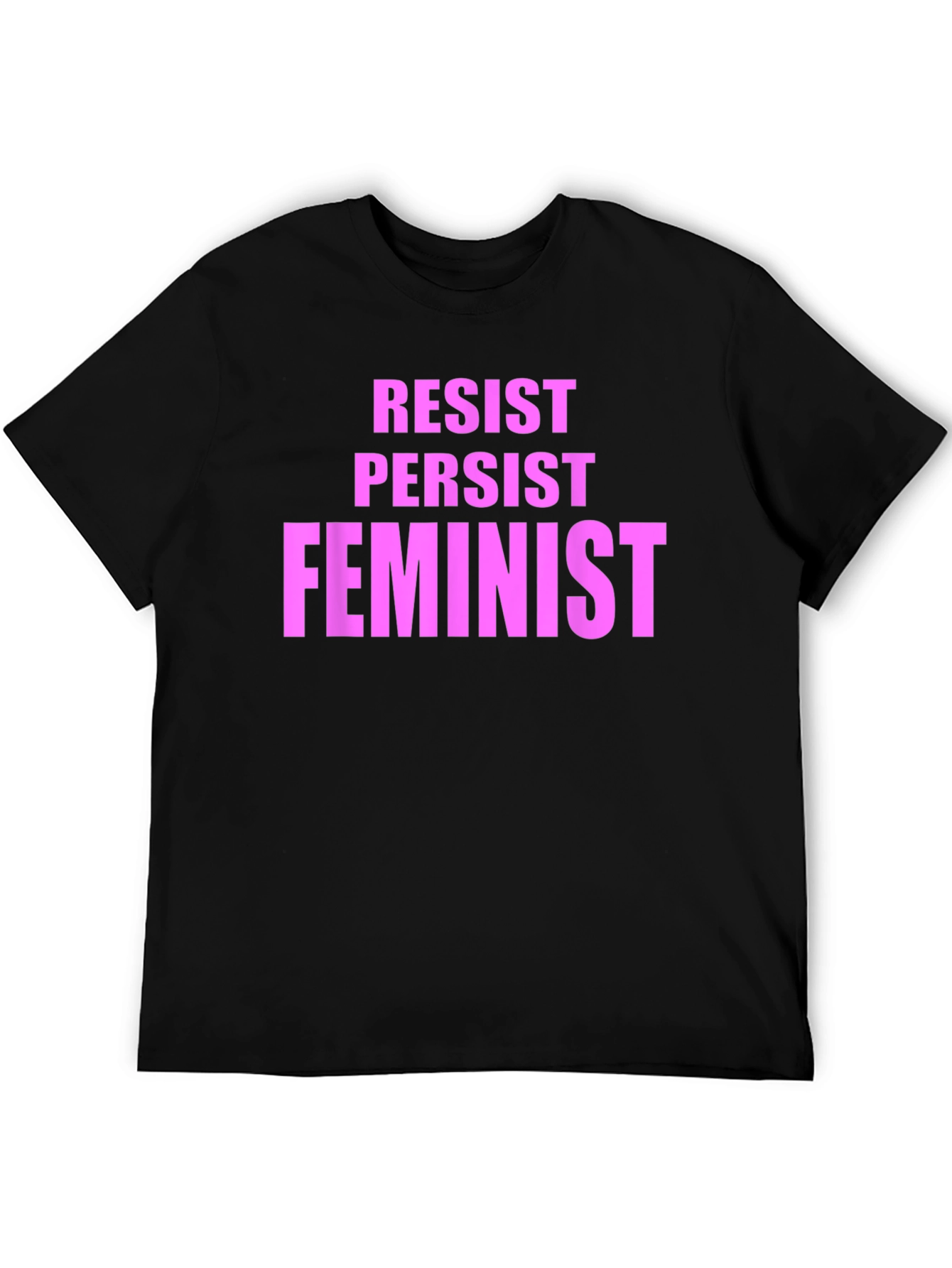Make a statement with this bold, black t-shirt featuring the empowering message "Resist Persist Feminist" in vibrant pink lettering. Crafted from a soft, comfortable fabric, this tee offers a relaxed fit perfect for everyday wear. The eye-catching design and strong message make it ideal for protests, rallies, or simply expressing your feminist ideals. This stylish and impactful t-shirt is a must-have addition to any socially conscious wardrobe. Show your support for equality and justice in this powerful and fashionable statement piece.