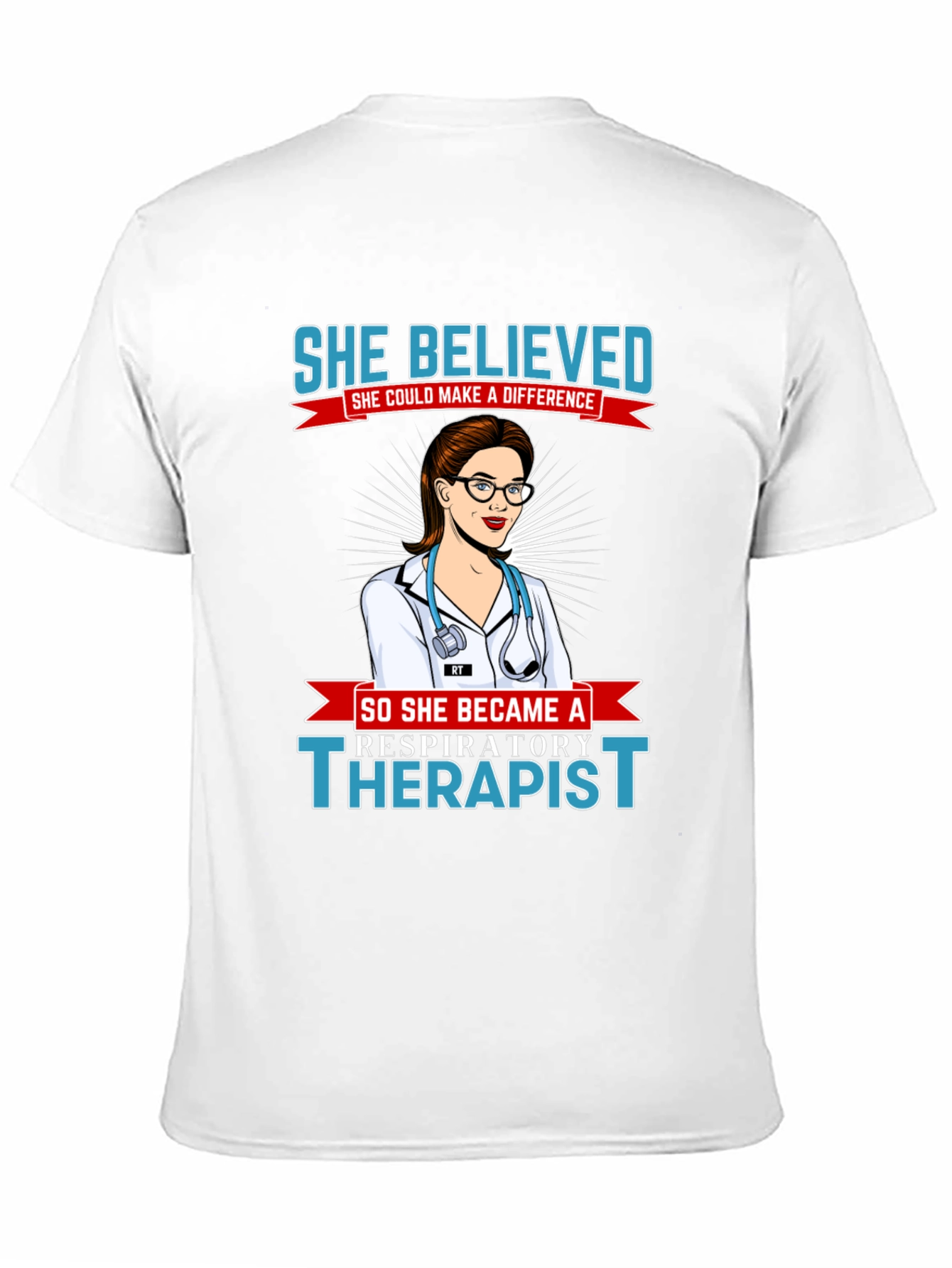 Show your appreciation for respiratory therapists with this stylish t-shirt. The design features an illustrated woman in medical attire along with the phrase "She Believed She Could Make A Difference So She Became a Respiratory Therapist". The shirt is black and appears to be made of a comfortable, breathable material. It is a great way to display your profession or show support for healthcare workers. Perfect for everyday wear, medical conferences, or as a thoughtful gift for the respiratory therapist in your life. The bold design and meaningful message make this t-shirt a standout piece in any wardrobe.