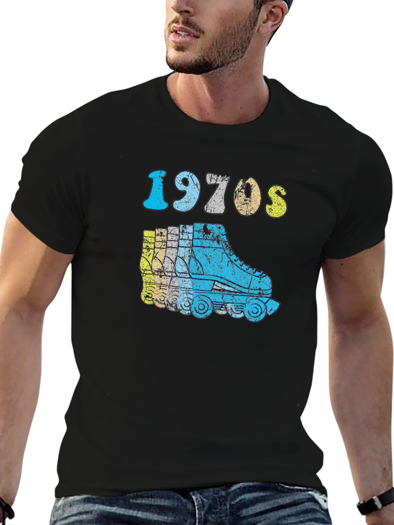 Step back in time with this vintage-inspired 1970s roller skate t-shirt. The shirt features a classic roller skate design with a retro font, perfect for skating enthusiasts and vintage lovers alike. The graphic showcases vibrant shades of blue, gray and yellow that give it a unique, eye-catching appeal. Crafted from a comfortable cotton blend, this t-shirt is perfect for everyday wear or a fun night out at the roller rink. The bold design is sure to turn heads and spark conversations. Show off your love for the good old days with this stylish and nostalgic tee!