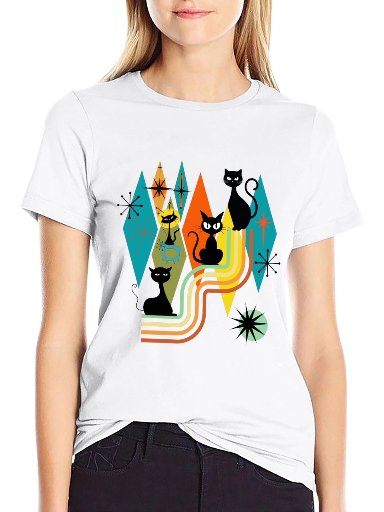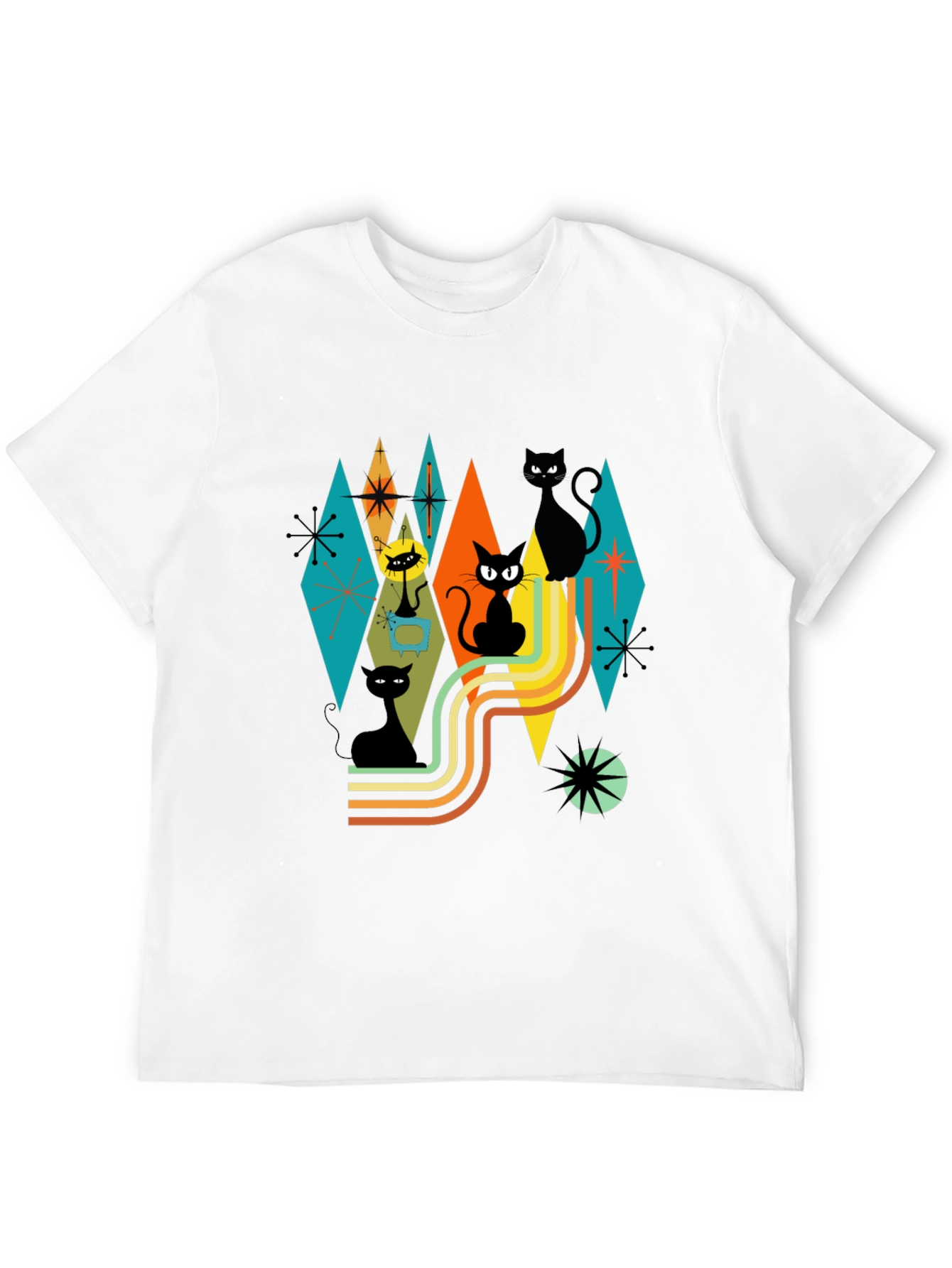 Show off your quirky side with this unique black T-shirt featuring a retro atomic cats design. The shirt showcases stylized black cats amidst mid-century modern diamond shapes in teal, orange, and yellow. A retro-striped path winds through the design, adding to its vintage charm. Made from a comfortable fabric, this tee is perfect for casual wear, parties, or anyone who loves vintage aesthetics and feline friends. It's a surefire conversation starter and adds a touch of retro cool to any outfit. Get yours today!