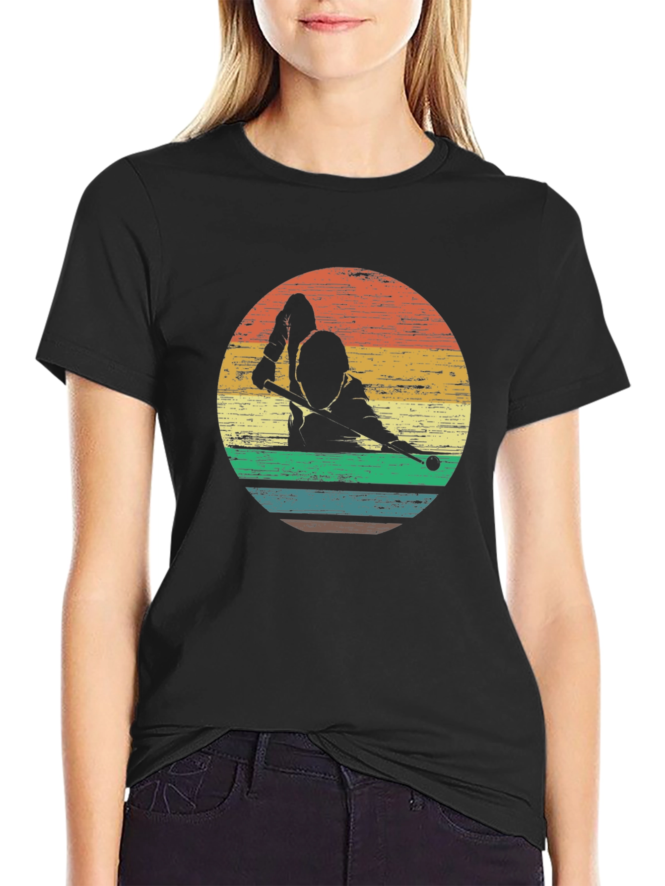 Showcase your love for billiards with this stylish black tee. The shirt features a vintage-inspired graphic of a pool player silhouetted against a vibrant, retro-striped circle. The design evokes a classic, cool vibe. Made from what appears to be comfortable, breathable cotton, this tee is perfect for casual wear, game nights, or a relaxed day out. The design is eye-catching, making this tee a conversation starter. Pair it with jeans or shorts for a laid-back look that shows off your unique style. A must-have for billiards enthusiasts!
