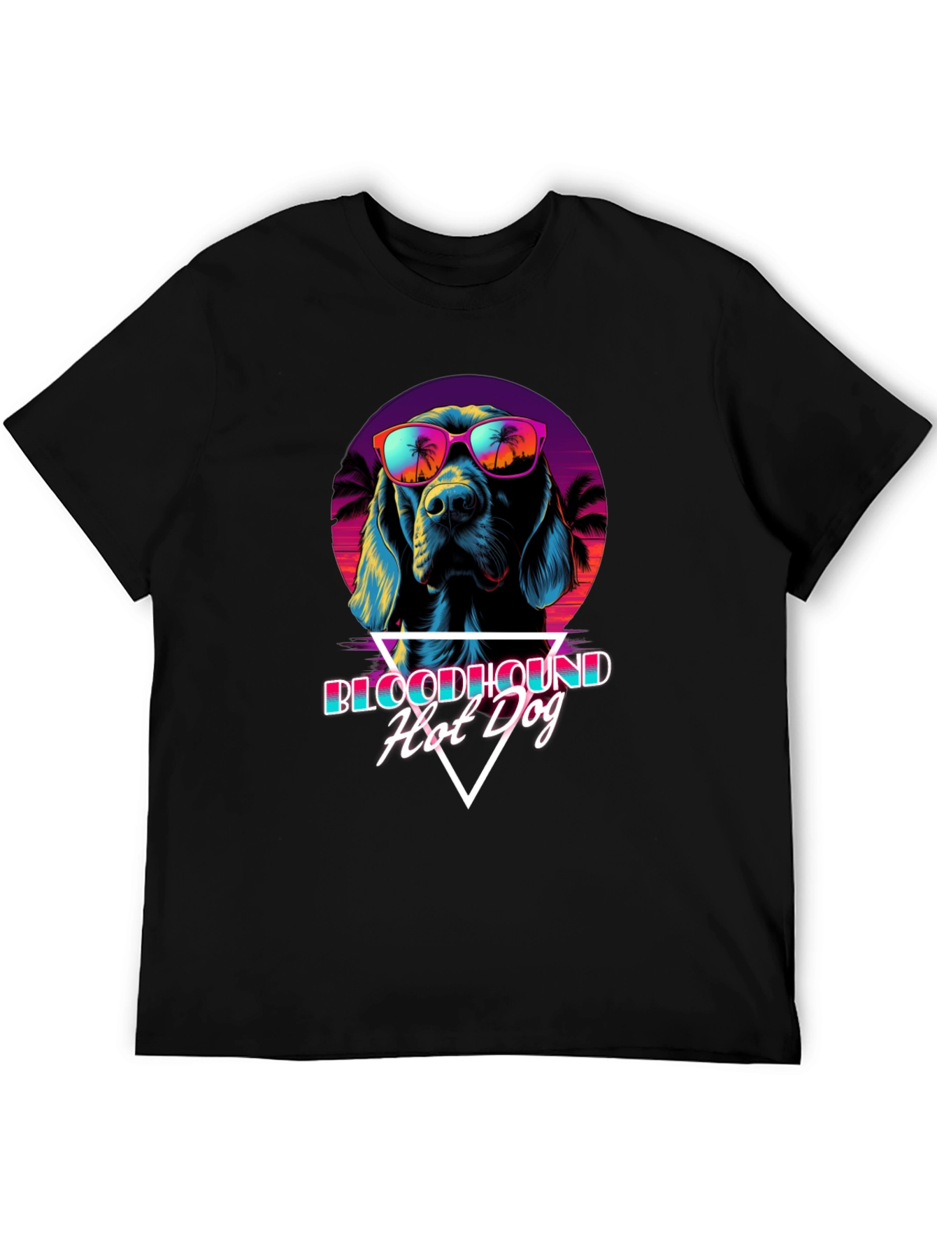 Embrace a touch of retro cool with this black graphic tee featuring a Bloodhound wearing sunglasses! The vibrant design includes a nostalgic sunset backdrop and the playful text "Bloodhound Hot Dog." Crafted from comfortable, breathable fabric, this t-shirt is perfect for casual wear, dog lovers, or anyone who enjoys a vintage aesthetic. The unique design is sure to turn heads and spark conversation. Great for everyday wear, dog walks, or as a fun gift for the dog lover in your life. Show off your quirky style with this eye-catching tee!