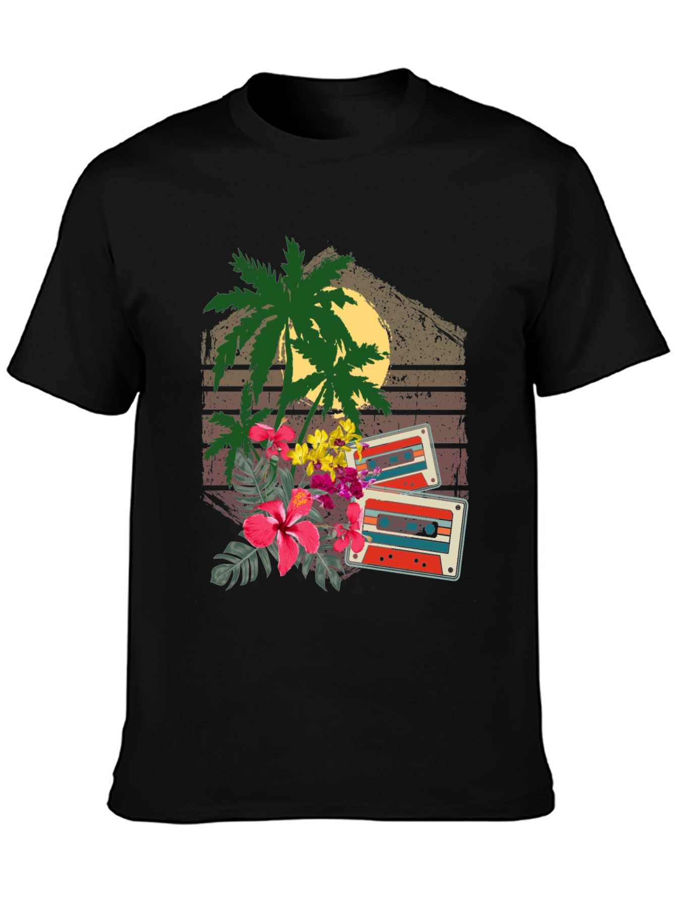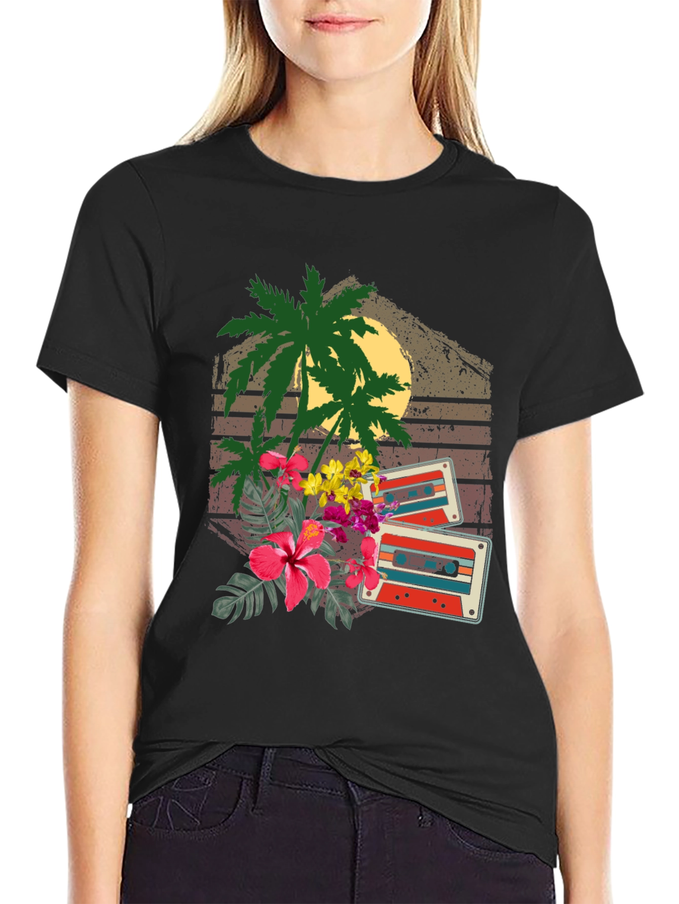 Capture the vintage vibes with this eye-catching graphic tee. Featuring a retro design with palm trees, sunset hues, vibrant hibiscus flowers, and classic cassette tapes, this shirt is a nostalgic nod to the past. The design is printed on a comfortable, black short-sleeve tee. Perfect for casual wear, music lovers, or anyone who appreciates a touch of retro style, this tee is sure to make a statement. Pair it with jeans, shorts, or a skirt for a cool, laid-back look. Add a touch of fun to your wardrobe with this unique graphic tee that blends tropical vibes with classic sounds.