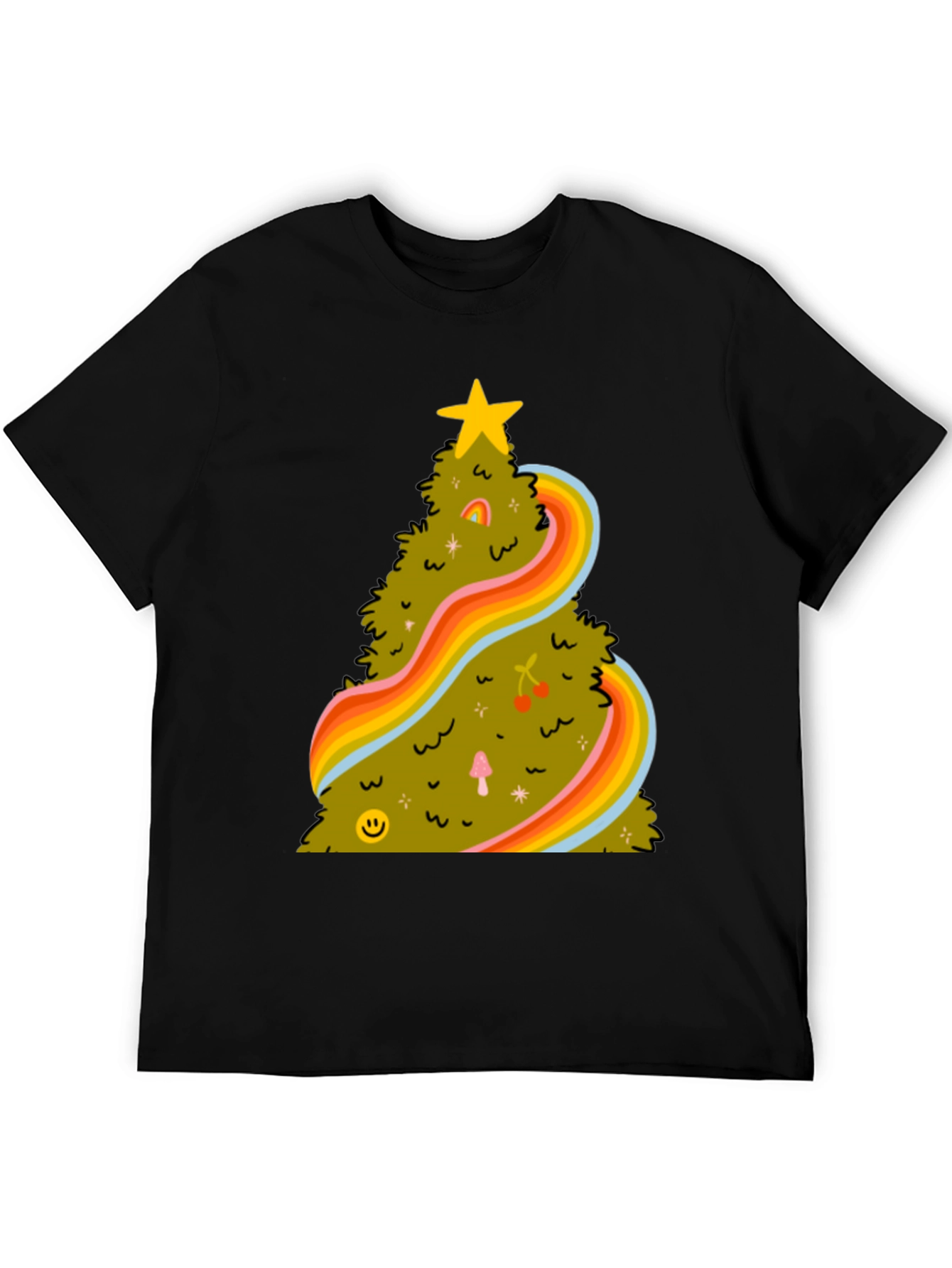 Spread holiday cheer with this fun retro-inspired Christmas tree t-shirt! The black tee features a whimsically designed Christmas tree adorned with a bright yellow star topper. A vibrant rainbow cascades down the tree, adding a playful touch. Other cute details such as smiley faces, stars, cherries, a mushroom, and rainbows embellish the tree. Perfect for holiday parties, casual outings, or cozy nights in. Get yours now and add a touch of groovy style to your festive wardrobe!