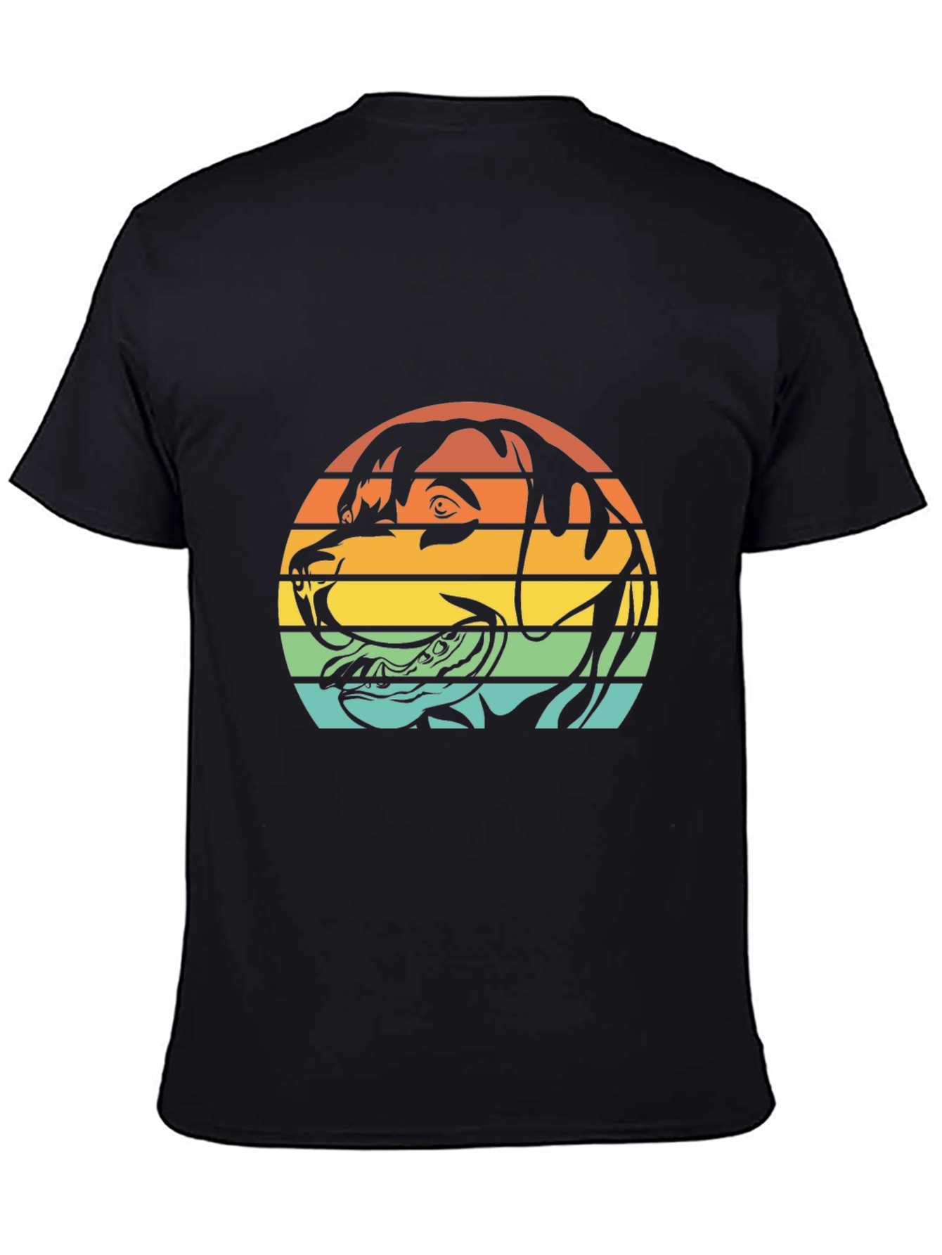 Show off your love for dogs with this stylish black t-shirt. Featuring a vintage-inspired design, it showcases a silhouette of a dog's head set against a colorful retro sunset. The vibrant stripes of orange, yellow, green, and teal create a visually appealing contrast against the dark fabric. This tee is perfect for casual wear and makes a great gift for any dog enthusiast. Comfortable and eye-catching, it's sure to become a favorite in your wardrobe. Whether you're walking your furry friend or simply relaxing, this t-shirt adds a touch of canine charm to your outfit.