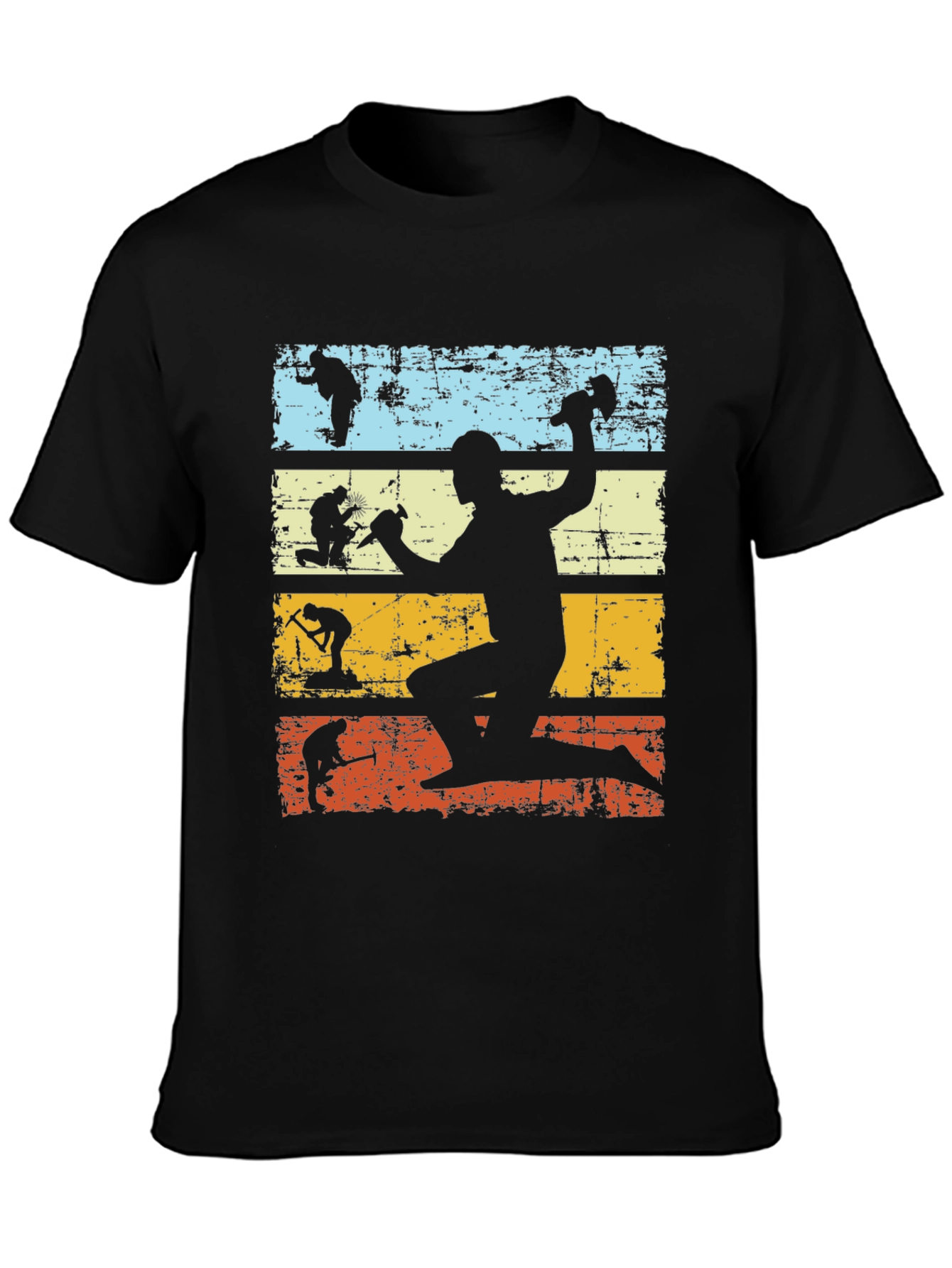 Show off your love for construction with this vintage-inspired black T-shirt. The shirt features a retro design with a multi-colored background, showcasing the evolution of a construction worker. Silhouetted figures depict various stages and tasks. Made from a comfortable fabric, it's perfect for casual wear or as a conversation starter. Express your passion for construction and the skilled trades.