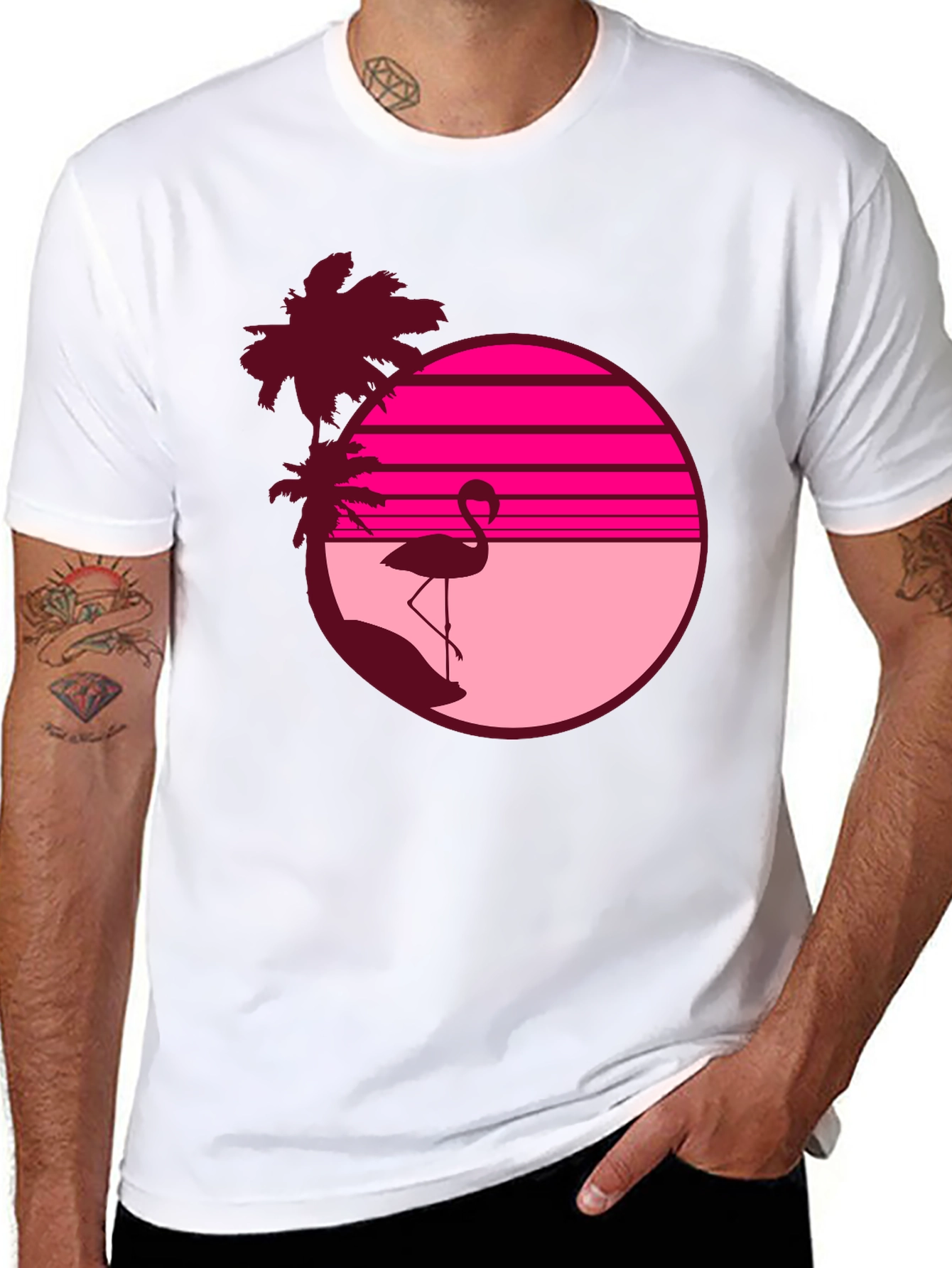 Capture the essence of summer with this eye-catching black t-shirt featuring a retro-inspired flamingo design. The circular graphic showcases a silhouette of a flamingo standing near a palm tree against a vibrant pink sunset. The design evokes a sense of tropical relaxation and vintage style. Made from a soft, comfortable fabric, this tee is perfect for casual wear, beach outings, or adding a splash of color to your everyday wardrobe. Ideal for flamingo lovers and those who appreciate unique, retro aesthetics. Stand out from the crowd with this stylish and comfortable tee!