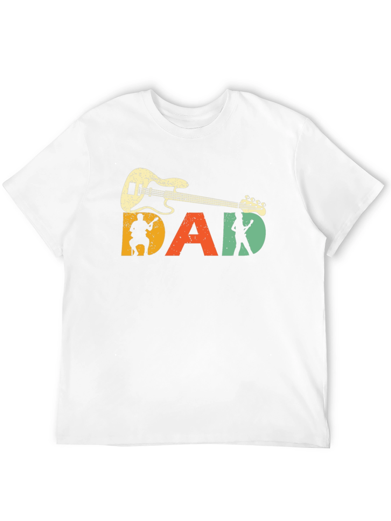 This black t-shirt features a vintage-inspired design perfect for music-loving dads. A classic electric guitar graphic stretches across the top, while the word "DAD" is cleverly illustrated with silhouettes of guitarists. The design incorporates retro color blocking in yellow, orange, and teal for a cool, throwback aesthetic. Crafted from a comfortable-looking fabric, this tee is ideal for casual wear, gigs, or family gatherings. Show your appreciation for your guitar-playing father with this unique and stylish shirt. It's a fantastic gift for Father's Day, birthdays, or any occasion to celebrate a musical dad.