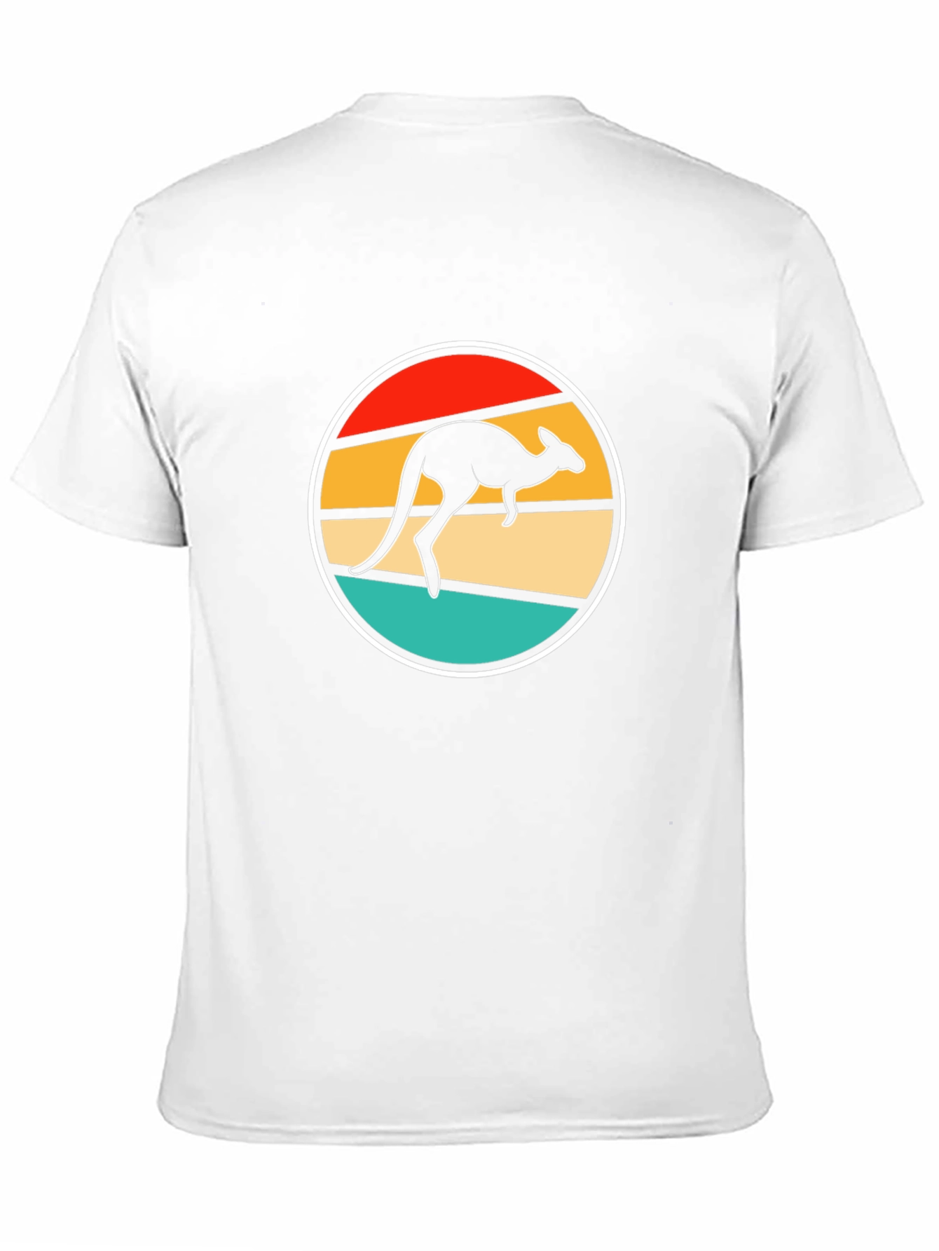 This stylish black t-shirt features a retro-inspired kangaroo design. The kangaroo silhouette is set against a vibrant, circular background with red, orange, beige, and teal horizontal stripes, all framed by a clean white border. The design evokes a vintage aesthetic while remaining contemporary. Made from a soft, comfortable fabric, this tee is perfect for casual wear. Show off your love for wildlife and unique designs with this eye-catching kangaroo t-shirt. Great for everyday wear, vacation, or as a gift for kangaroo enthusiasts.
