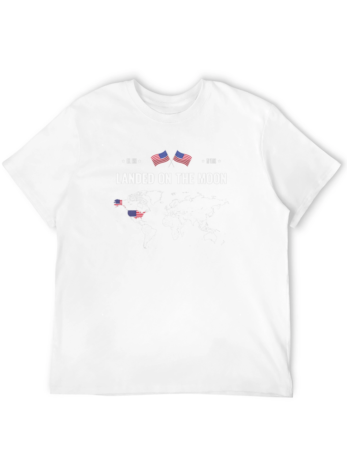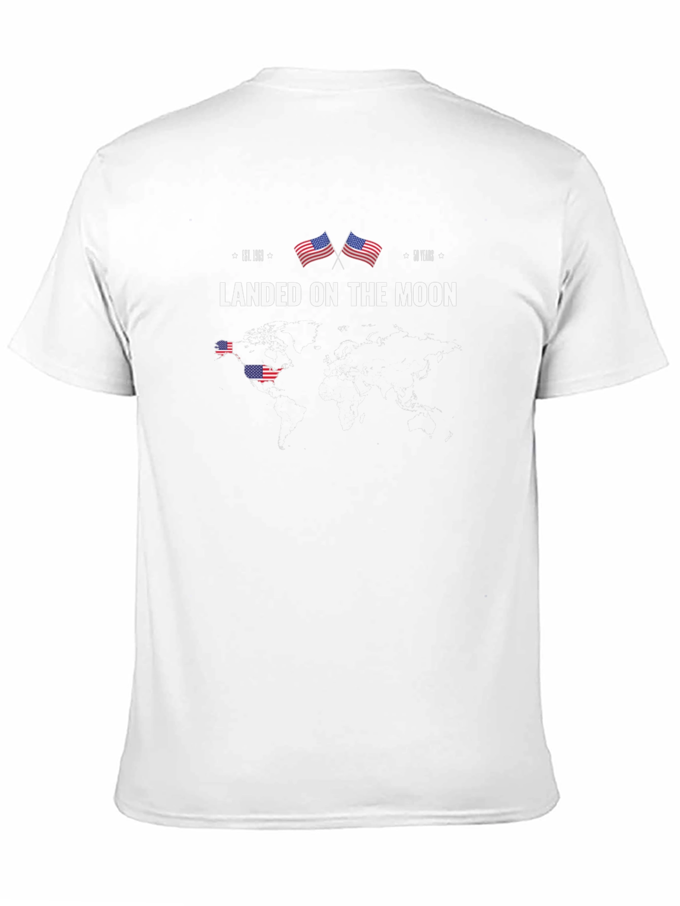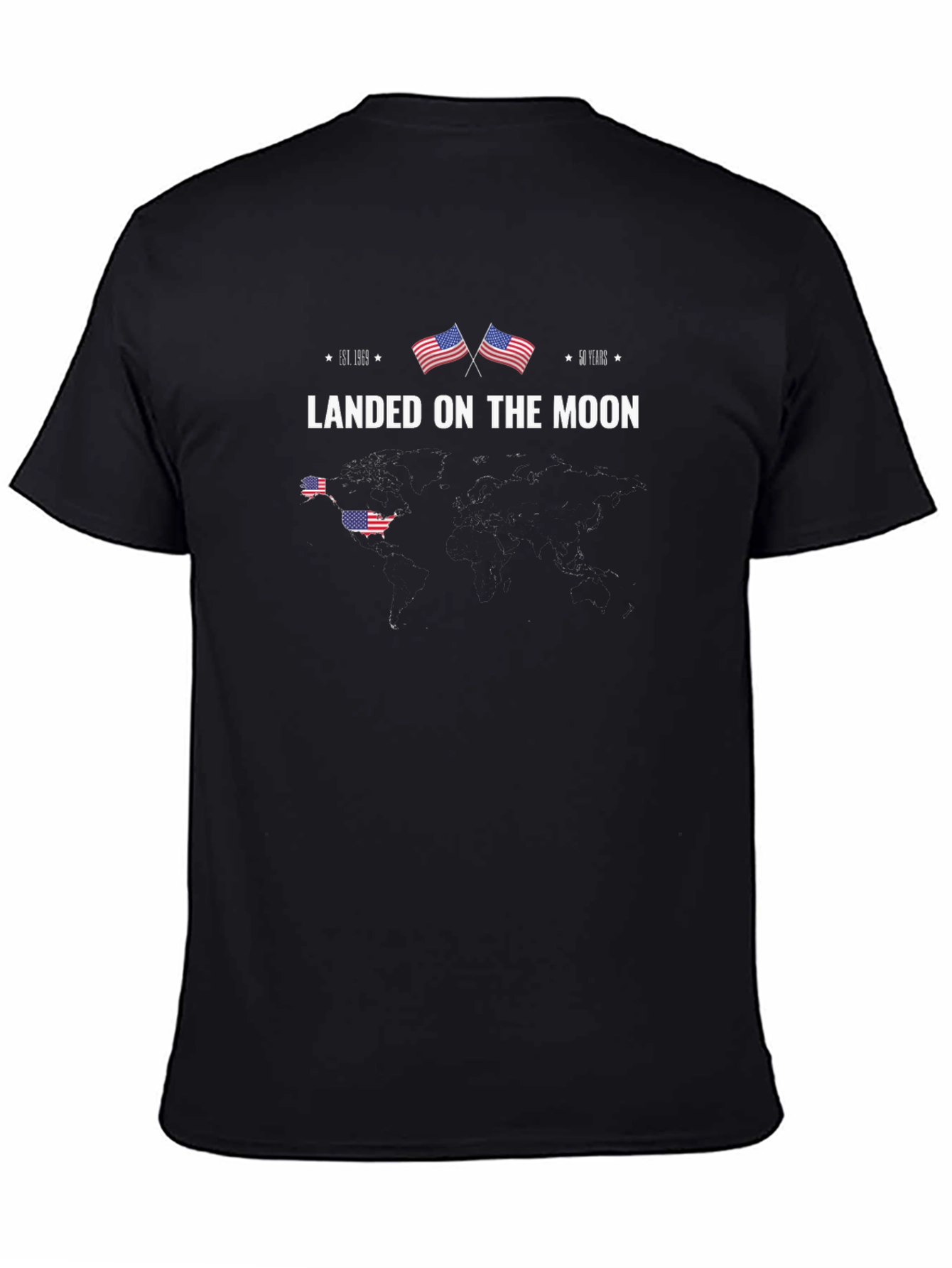 Celebrate a historic moment with this stylish black graphic t-shirt. The design features American flags and the words "Landed on the Moon," commemorating a significant anniversary. The shirt also includes the year 1969, further emphasizing its nostalgic appeal. Crafted from a comfortable-looking fabric, this tee offers both style and ease of wear. Ideal for casual outings, patriotic events, or simply showcasing your love for space exploration, this t-shirt is a versatile addition to any wardrobe. The classic black color makes it easy to pair with jeans, shorts, or any casual bottoms. Show off your unique style with this statement piece!