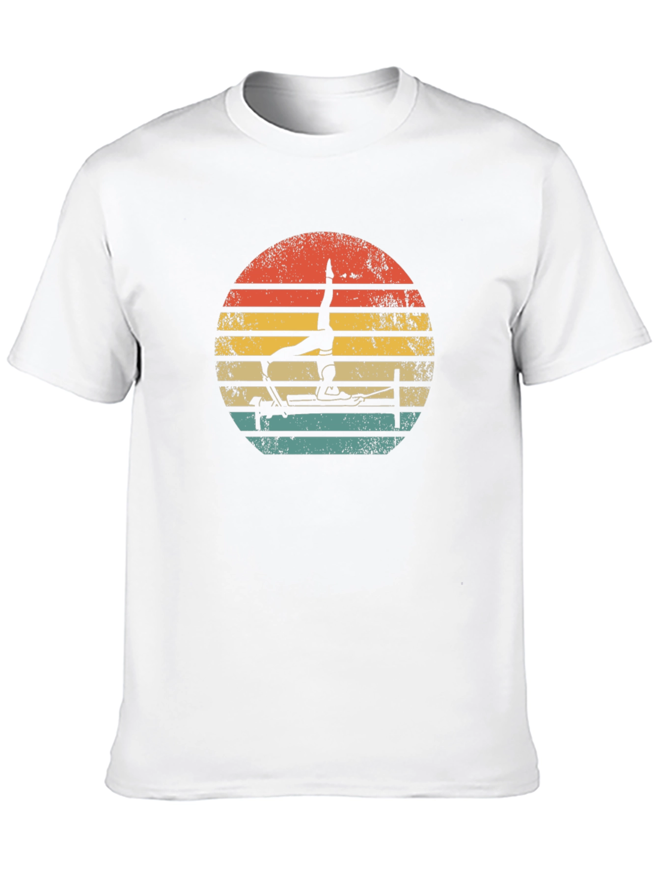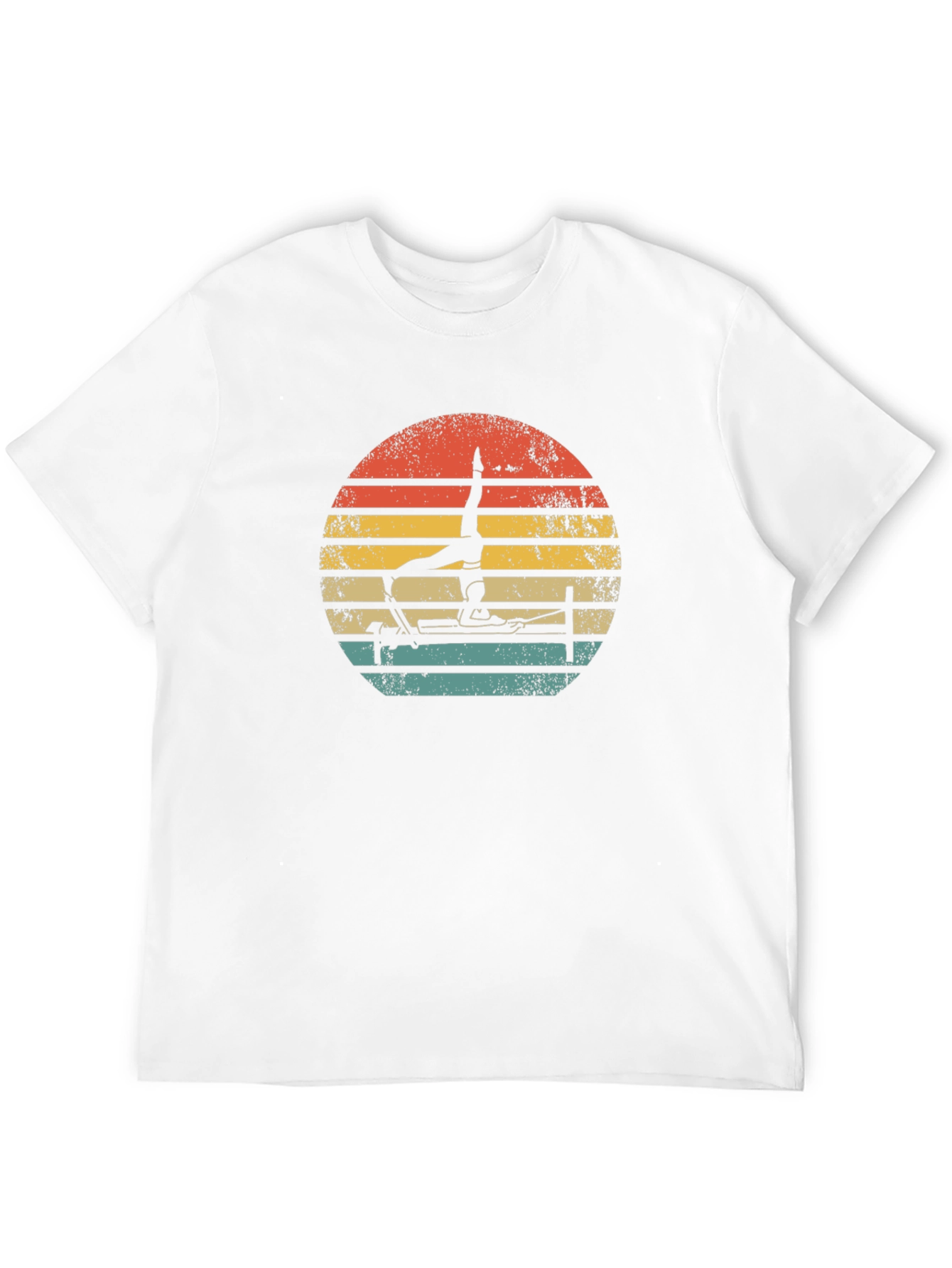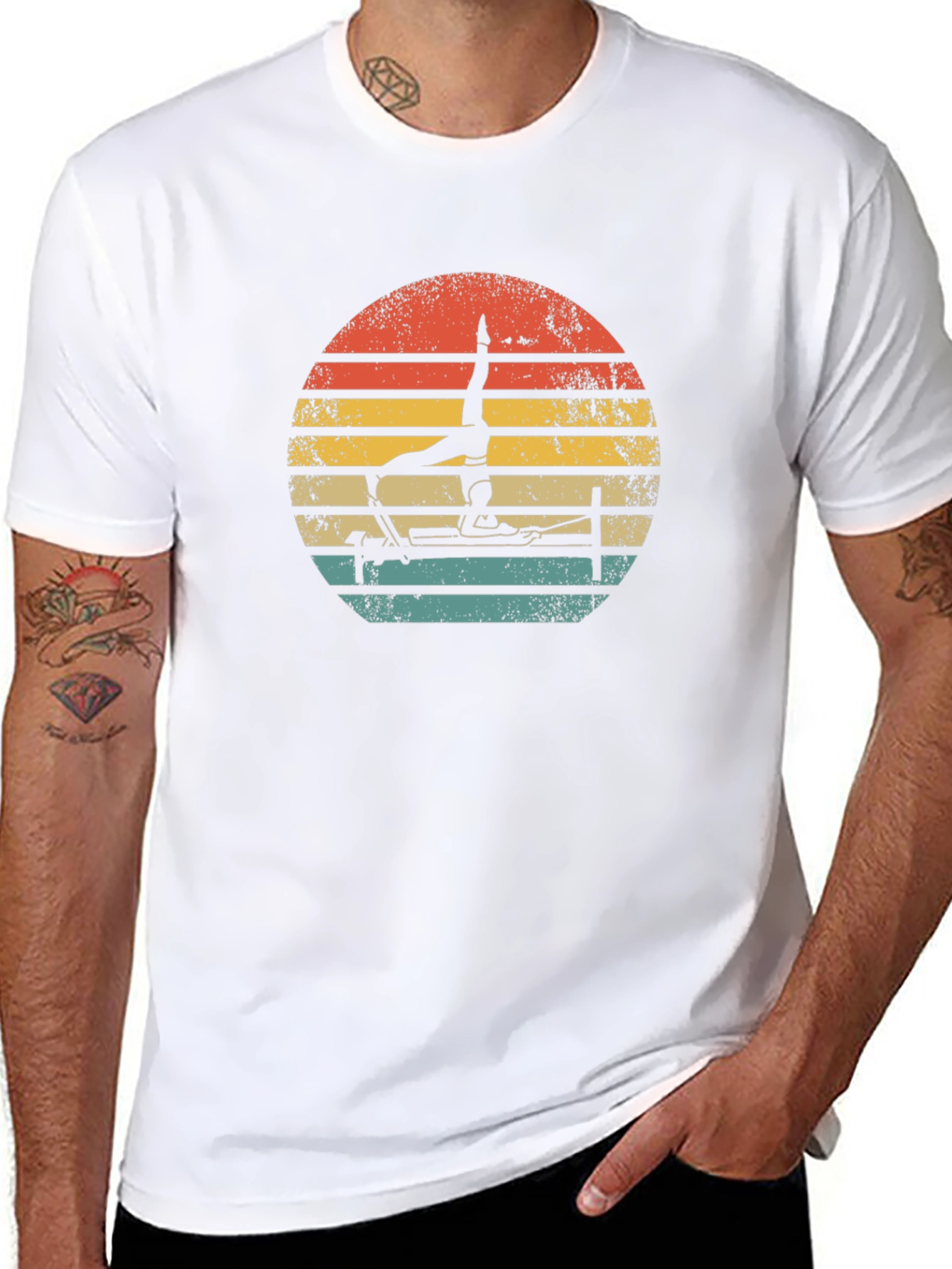 Embrace vintage vibes with this unique black t-shirt featuring a distressed retro design. The graphic showcases a silhouette of individuals engaged in Pilates exercises on a reformer machine, set against a vibrant sunburst background in shades of orange, yellow, teal and beige. The t-shirt's classic crew neck and short sleeves make it a versatile choice for everyday wear, casual outings, or Pilates studio sessions. Crafted from a soft-feel fabric, this tee ensures all-day comfort and breathability. Show off your love for Pilates and vintage style with this eye-catching t-shirt. Perfect for Pilates enthusiasts and those who appreciate retro-inspired fashion.