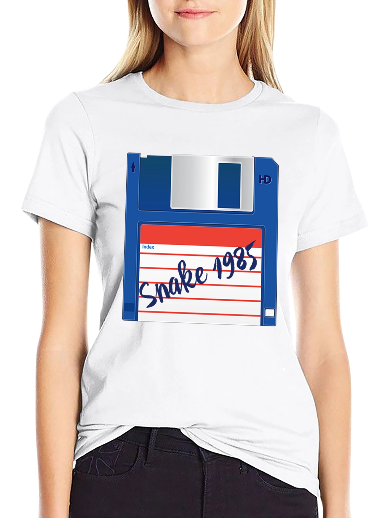 Step back in time with this nostalgic black t-shirt featuring a vibrant graphic of a classic floppy disk. The design includes a retro 'Snake 1985' label, adding a playful and vintage touch. Made from comfortable, breathable fabric, this shirt is perfect for everyday wear. The bold graphic stands out against the solid black background, making it a great conversation starter. Ideal for anyone who loves vintage computing, 80s nostalgia, or unique graphic tees. Wear it to casual outings, tech conventions, or simply to express your love for all things retro.