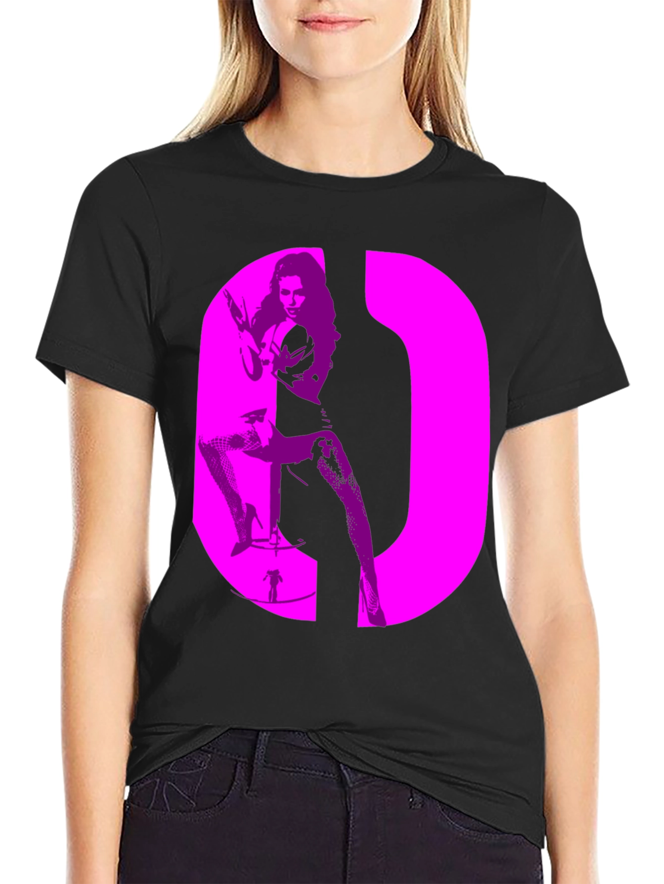 Make a statement with this eye-catching black t-shirt featuring a bold pink silhouette graphic. The design incorporates a vintage-inspired female figure, creating a unique and edgy look. The shirt appears to be made from a comfortable, soft fabric, perfect for everyday wear. Its classic fit makes it a versatile addition to any wardrobe, easily paired with jeans, shorts, or a skirt. Whether you're going for a casual or dressed-up style, this tee adds a touch of retro flair. Ideal for those who love unique, artistic designs and want to stand out from the crowd. Get yours today and express your individuality!