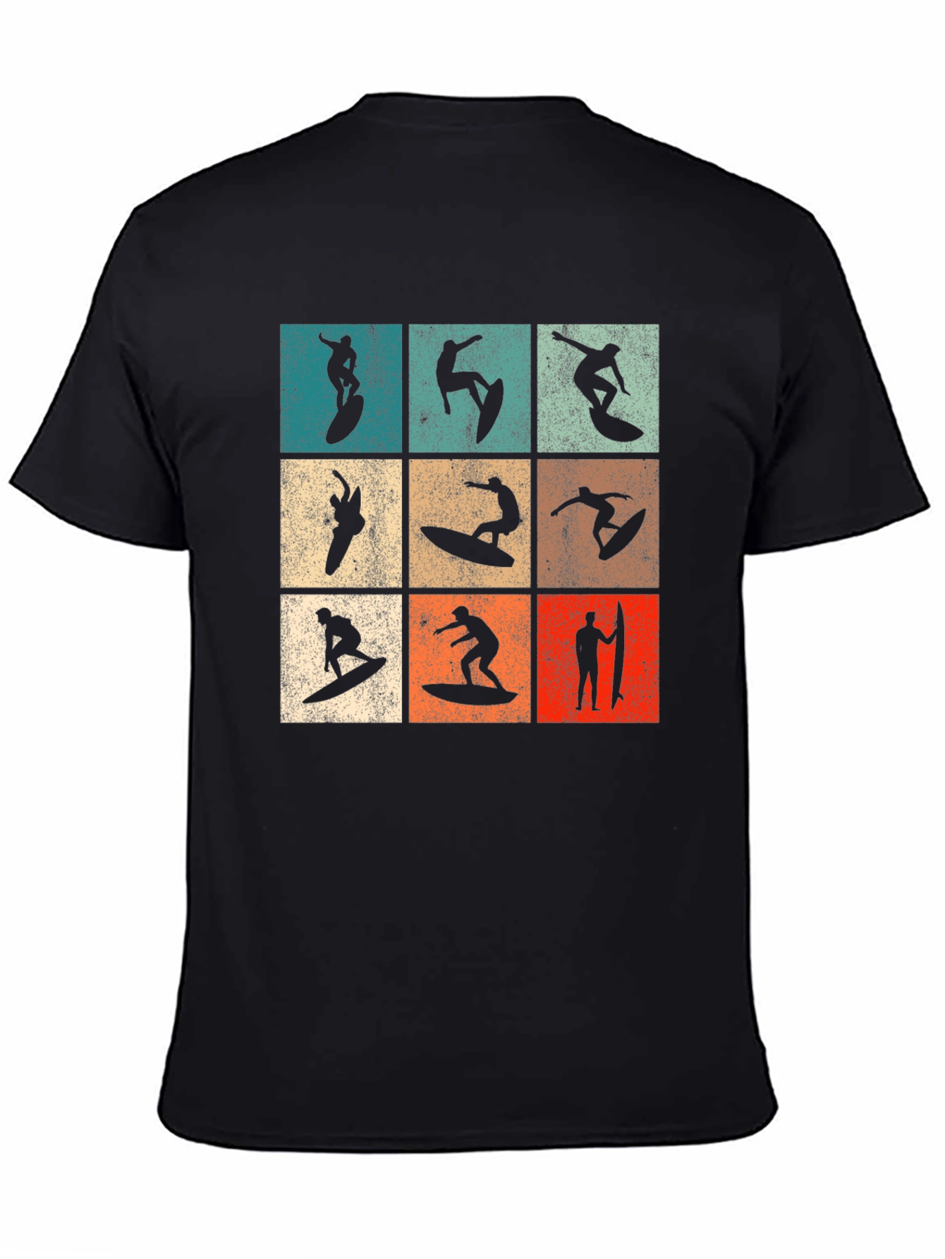 Ride the wave of style with this retro-inspired tee! This classic black t-shirt features a unique graphic print of surfer silhouettes in a vintage square design. The design contains nine squares each containing a silhouette of a surfer riding a wave. Made from comfortable, breathable fabric, it's perfect for everyday wear. The vintage design will be a fun conversation starter. Whether you're hitting the beach or hanging out, this shirt is a must-have for surf enthusiasts and anyone who loves a touch of retro cool. Show off your love for surfing with this eye-catching piece!